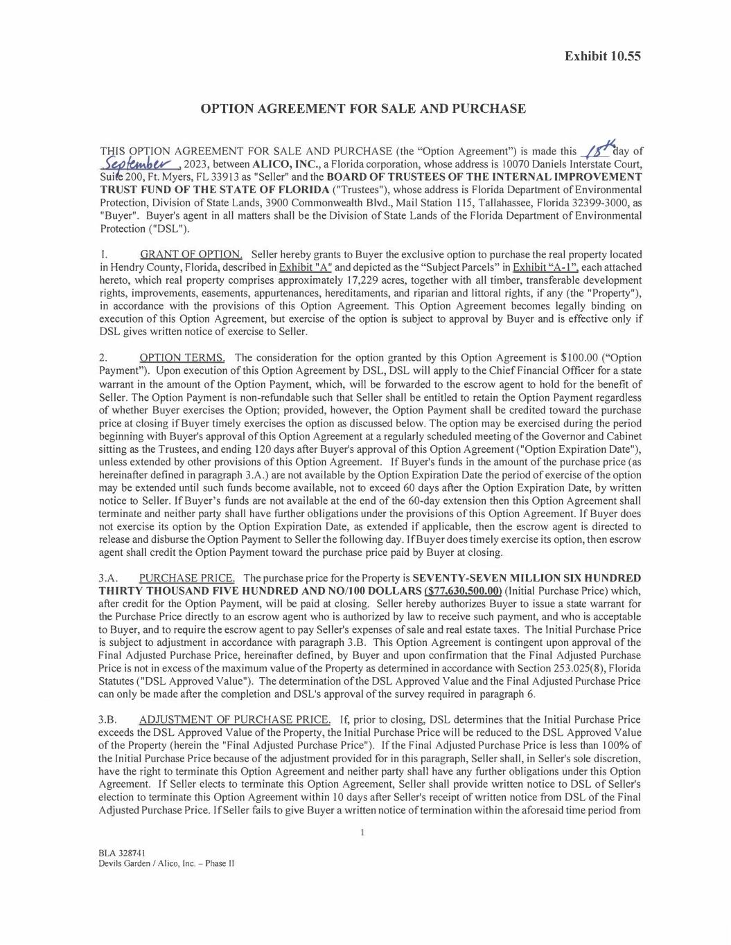 OPTION AGREEMENT FOR SALE AND PURCHASE THIS OPTION AGREEMENT FOR SALE AND PURCHASE (the "Option Agreement") is made this _/£day of -�t�l,v , 2023, between ALI CO, INC., a Florida corporation, whose address is I 0070 Daniels Interstate Court, Sui e 200, Ft. Myers, FL 33913 as "Seller" and the BOARD OF TRUSTEES OF THE INTERNAL IMPROVEMENT TRUST FUND OF THE ST ATE OF FLORIDA ("Trustees"), whose address is Florida Department of Environmental Protection, Division of State Lands, 3900 Commonwealth Blvd., Mail Station 115, Tallahassee, Florida 32399-3000, as "Buyer". Buyer"s agent in all matters shall be the Division of State Lands of the Florida Department of Environmental Protection ("DSL"). I. GRANT OF OPTION. Seller hereby grants to Buyer the exclusive option to purchase the real property located in Hendry County, Florida, described in Exhibit "A" and depicted as the "Subject Parcels" in Exhibit "A-1", each attached hereto, which real property comprises approximately 17,229 acres, together with all timber, transferable development rights, improvements, easements, appurtenances, hereditaments, and riparian and littoral rights, if any (the "Property"), in accordance with the provisions of this Option Agreement. This Option Agreement becomes legally binding on execution of this Option Agreement, but exercise of the option is subject to approval by Buyer and is effective only if DSL gives written notice of exercise to Seller. 2. OPTION TERMS. The consideration for the option granted by this Option Agreement is $100.00 ("Option Payment"). Upon execution of this Option Agreement by DSL, DSL will apply to the ChiefFinancial Officer for a state warrant in the amount of the Option Payment, which, will be forwarded to the escrow agent to hold for the benefit of Seller. The Option Payment is non-refundable such that Seller shall be entitled to retain the Option Payment regardless of whether Buyer exercises the Option; provided, however, the Option Payment shall be credited toward the purchase price at closing if Buyer timely exercises the option as discussed below. The option may be exercised during the period beginning with Buyer's approval of this Option Agreement at a regularly scheduled meeting of the Governor and Cabinet sitting as the Trustees, and ending 120 days after Buyer's approval of this Option Agreement ("Option Expiration Date"), unless extended by other provisions of this Option Agreement. If Buyer's funds in the amount of the purchase price (as hereinafter defined in paragraph 3.A.) are not available by the Option Expiration Date the period of exercise of the option may be extended until such funds become available, not to exceed 60 days after the Option Expiration Date, by written notice to Seller. If Buyer's funds are not available at the end of the 60-day extension then this Option Agreement shall terminate and neither party shall have further obligations under the provisions of this Option Agreement. If Buyer does not exercise its option by the Option Expiration Date, as extended if applicable, then the escrow agent is directed to release and disburse the Option Payment to Seller the following day. If Buyer does timely exercise its option, then escrow agent shall credit the Option Payment toward the purchase price paid by Buyer at closing. 3.A. PURCHASE PRICE. The purchase price for the Property is SEVENTY-SEVEN MILLION SIX HUNDRED THIRTY THOUSAND FIVE HUNDRED AND NO/JOO DOLLARS ($77,630,500.00) (Initial Purchase Price) which, after credit for the Option Payment, will be paid at closing. Seller hereby authorizes Buyer to issue a state warrant for the Purchase Price directly to an escrow agent who is authorized by law to receive such payment, and who is acceptable to Buyer, and to require the escrow agent to pay Seller's expenses of sale and real estate taxes. The Initial Purchase Price is subject to adjustment in accordance with paragraph 3.B. This Option Agreement is contingent upon approval of the Final Adjusted Purchase Price, hereinafter defined, by Buyer and upon confirmation that the Final Adjusted Purchase Price is not in excess of the maximum value of the Property as determined in accordance with Section 253.025(8), Florida Statutes ("DSL Approved Value"). The determination of the DSL Approved Value and the Final Adjusted Purchase Price can only be made after the completion and DSL's approval of the survey required in paragraph 6. 3.B. ADJUSTMENT OF PURCHASE PRICE. If, prior to closing, DSL determines that the Initial Purchase Price exceeds the DSL Approved Value of the Property, the Initial Purchase Price will be reduced to the DSL Approved Value of the Property (herein the "Final Adjusted Purchase Price"). If the Final Adjusted Purchase Price is less than 100% of the Initial Purchase Price because of the adjustment provided for in this paragraph, Seller shall, in Seller's sole discretion, have the right to terminate this Option Agreement and neither party shall have any further obligations under this Option Agreement. If Seller elects to terminate this Option Agreement, Seller shall provide written notice to DSL of Seller's election to terminate this Option Agreement within 10 days after Seller's receipt of written notice from DSL of the Final Adjusted Purchase Price. If Seller fails to give Buyer a written notice of termination within the aforesaid time period from BLA 328741 Devils Garden I Alico, Inc. - Phase 11 Exhibit 10.55