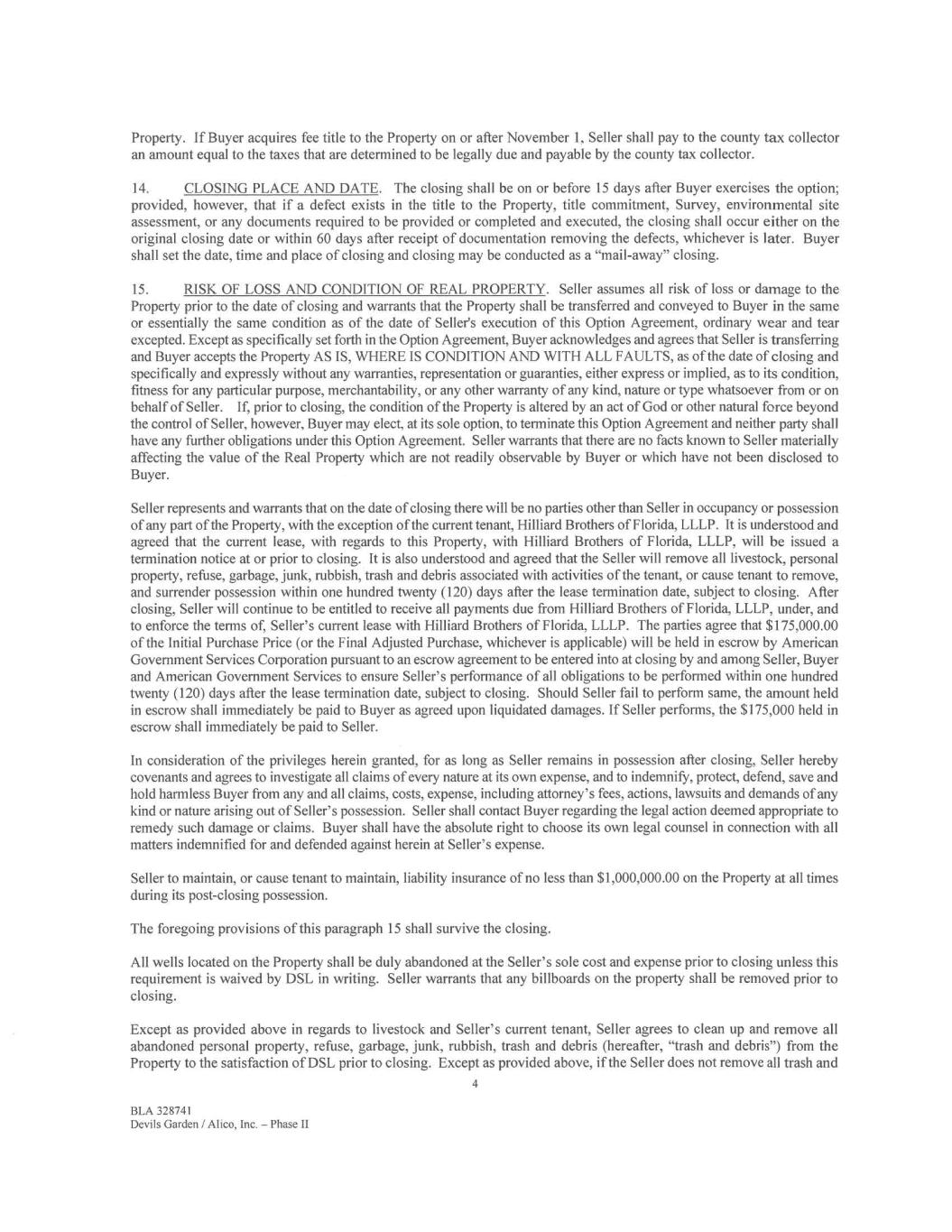 Property. If Buyer acquires fee title to the Property on or after November 1, Seller shall pay to the county tax collector an amount equal to the taxes that are determined to be legally due and payable by the county tax collector. 14. CLOSING PLACE AND DATE. The closing shall be on or before 15 days after Buyer exercises the option; provided, however, that if a defect exists in the title to the Property, title commitment, Survey, environmental site assessment, or any documents required to be provided or completed and executed, the closing shall occur either on the original closing date or within 60 days after receipt of documentation removing the defects, whichever is later. Buyer shall set the date, time and place of closing and closing may be conducted as a "mail -away" closing. 15. RISK OF LOSS AND CONDITION OF REAL PROPERTY. Seller assumes all risk of loss or damage to the Property prior to the date of closing and warrants that the Property shall be transferred and conveyed to Buyer in the same or essentially the same condition as of the date of Seller's execution of this Option Agreement, ordinary wear and tear excepted. Except as specifically set forth in the Option Agreement, Buyer acknowledges and agrees that Seller is transferring and Buyer accepts the Property AS IS, WHERE IS CONDITION AND WITH ALL FAULTS, as of the date of closing and specifically and expressly without any warranties, representation or guaranties, either express or implied, as to its condition, fitness for any particular purpose, merchantability, or any other warranty of any kind, nature or type whatsoever from or on behalf of Seller. If, prior to closing, the condition of the Property is altered by an act of God or other natural force beyond the control of Seller, however, Buyer may elect, at its sole option, to terminate this Option Agreement and neither party shall have any further obligations under this Option Agreement. Seller warrants that there are no facts known to Seller materially affecting the value of the Real Property which are not readily observable by Buyer or which have not been disclosed to Buyer. Seller represents and warrants that on the date of closing there will be no parties other than Seller in occupancy or possession of any part of the Property, with the exception of the current tenant, Hilliard Brothers of Florida, LLLP. It is understood and agreed that the current lease, with regards to this Property, with Hilliard Brothers of Florida, LLLP, will be issued a termination notice at or prior to closing. It is also understood and agreed that the Seller will remove all livestock, personal property, refuse, garbage, junk, rubbish, trash and debris associated with activities of the tenant, or cause tenant to remove, and surrender possession within one hundred twenty (120) days after the lease termination date, subject to closing. After closing, Seller will continue to be entitled to receive all payments due from Hilliard Brothers of Florida, LLLP, under, and to enforce the terms of, Seller's current lease with Hilliard Brothers of Florida, LLLP. The parties agree that $175,000.00 of the Initial Purchase Price (or the Final Adjusted Purchase, whichever is applicable) will be held in escrow by American Government Services Corporation pursuant to an escrow agreement to be entered into at closing by and among Seller, Buyer and American Government Services to ensure Seller's performance of all obligations to be performed within one hundred twenty (120) days after the lease termination date, subject to closing. Should Seller fail to perform same, the amount held in escrow shall immediately be paid to Buyer as agreed upon liquidated damages. If Seller performs, the $175,000 held in escrow shall immediately be paid to Seller. In consideration of the privileges herein granted, for as long as Seller remains in possession after closing, Seller hereby covenants and agrees to investigate all claims of every nature at its own expense, and to indemnify, protect, defend, save and hold harmless Buyer from any and all claims, costs, expense, including attorney's fees, actions, lawsuits and demands of any kind or nature arising out of Seller's possession. Seller shall contact Buyer regarding the legal action deemed appropriate to remedy such damage or claims. Buyer shall have the absolute right to choose its own legal counsel in connection with all matters indemnified for and defended against herein at Seller's expense. Seller to maintain, or cause tenant to maintain, liability insurance of no less than $1,000,000.00 on the Property at all times during its post-closing possession. The foregoing provisions of this paragraph 15 shall survive the closing. All wells located on the Property shall be duly abandoned at the Seller's sole cost and expense prior to closing unless this requirement is waived by DSL in writing. Seller warrants that any billboards on the property shall be removed prior to closing. Except as provided above in regards to livestock and Seller's current tenant, Seller agrees to clean up and remove all abandoned personal property, refuse, garbage, junk, rubbish, trash and debris (hereafter, "trash and debris") from the Property to the satisfaction of DSL prior to closing. Except as provided above, if the Seller does not remove all trash and 4 BLA 328741 Devils Garden / Alico, Inc. — Phase II