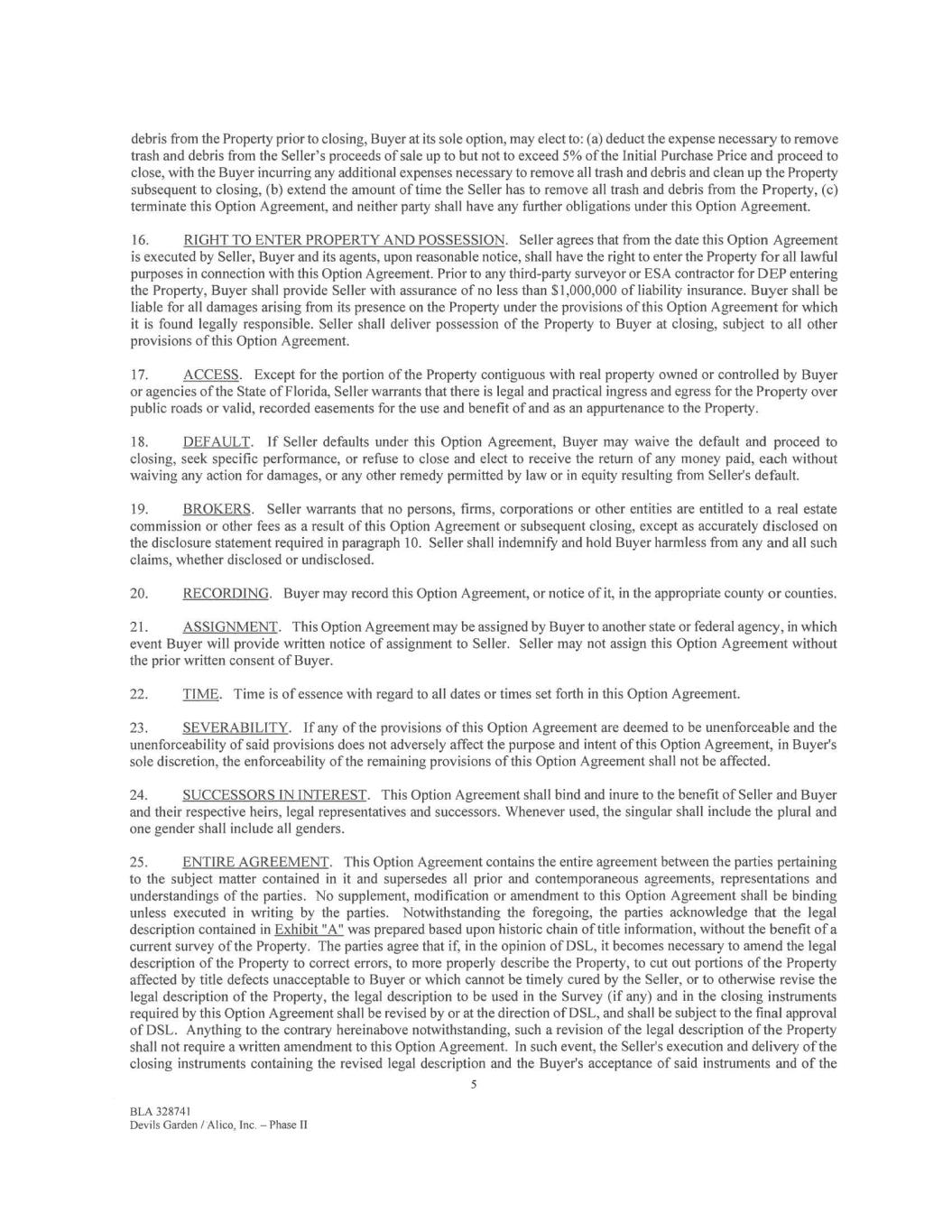 debris from the Property prior to closing, Buyer at its sole option, may elect to: (a) deduct the expense necessary to remove trash and debris from the Seller's proceeds of sale up to but not to exceed 5% of the Initial Purchase Price and proceed to close, with the Buyer incurring any additional expenses necessary to remove all trash and debris and clean up the Property subsequent to closing, (b) extend the amount of time the Seller has to remove all trash and debris from the Property, (c) terminate this Option Agreement, and neither party shall have any further obligations under this Option Agreement. 16. RIGHT TO ENTER PROPERTY AND POSSESSION. Seller agrees that from the date this Option Agreement is executed by Seller, Buyer and its agents, upon reasonable notice, shall have the right to enter the Property for all lawful purposes in connection with this Option Agreement. Prior to any third-party surveyor or ESA contractor for DEP entering the Property, Buyer shall provide Seller with assurance of no less than $1,000,000 of liability insurance. Buyer shall be liable for all damages arising from its presence on the Property under the provisions of this Option Agreement for which it is found legally responsible. Seller shall deliver possession of the Property to Buyer at closing, subject to all other provisions of this Option Agreement. 17. ACCESS. Except for the portion of the Property contiguous with real property owned or controlled by Buyer or agencies of the State of Florida, Seller warrants that there is legal and practical ingress and egress for the Property over public roads or valid, recorded easements for the use and benefit of and as an appurtenance to the Property. 18. DEFAULT. If Seller defaults under this Option Agreement, Buyer may waive the default and proceed to closing, seek specific performance, or refuse to close and elect to receive the return of any money paid, each without waiving any action for damages, or any other remedy permitted by law or in equity resulting from Seller's default. 19. BROKERS. Seller warrants that no persons, firms, corporations or other entities are entitled to a real estate commission or other fees as a result of this Option Agreement or subsequent closing, except as accurately disclosed on the disclosure statement required in paragraph 10. Seller shall indemnify and hold Buyer harmless from any and all such claims, whether disclosed or undisclosed. 20. RECORDING. Buyer may record this Option Agreement, or notice of it, in the appropriate county or counties. 21. ASSIGNMENT. This Option Agreement may be assigned by Buyer to another state or federal agency, in which event Buyer will provide written notice of assignment to Seller. Seller may not assign this Option Agreement without the prior written consent of Buyer. 22. TIME. Time is of essence with regard to all dates or times set forth in this Option Agreement. 23. SEVERABILITY. If any of the provisions of this Option Agreement are deemed to be unenforceable and the unenforceability of said provisions does not adversely affect the purpose and intent of this Option Agreement, in Buyer's sole discretion, the enforceability of the remaining provisions of this Option Agreement shall not be affected. 24. SUCCESSORS IN INTEREST. This Option Agreement shall bind and inure to the benefit of Seller and Buyer and their respective heirs, legal representatives and successors. Whenever used, the singular shall include the plural and one gender shall include all genders. 25. ENTIRE AGREEMENT. This Option Agreement contains the entire agreement between the parties pertaining to the subject matter contained in it and supersedes all prior and contemporaneous agreements, representations and understandings of the parties. No supplement, modification or amendment to this Option Agreement shall be binding unless executed in writing by the parties. Notwithstanding the foregoing, the parties acknowledge that the legal description contained in Exhibit "A" was prepared based upon historic chain of title information, without the benefit of a current survey of the Property. The parties agree that if, in the opinion of DSL, it becomes necessary to amend the legal description of the Property to correct errors, to more properly describe the Property, to cut out portions of the Property affected by title defects unacceptable to Buyer or which cannot be timely cured by the Seller, or to otherwise revise the legal description of the Property, the legal description to be used in the Survey (if any) and in the closing instruments required by this Option Agreement shall be revised by or at the direction of DSL, and shall be subject to the final approval of DSL. Anything to the contrary hereinabove notwithstanding, such a revision of the legal description of the Property shall not require a written amendment to this Option Agreement. In such event, the Seller's execution and delivery of the closing instruments containing the revised legal description and the Buyer's acceptance of said instruments and of the 5 BLA 328741 Devils Garden / Alico, Inc. — Phase II
