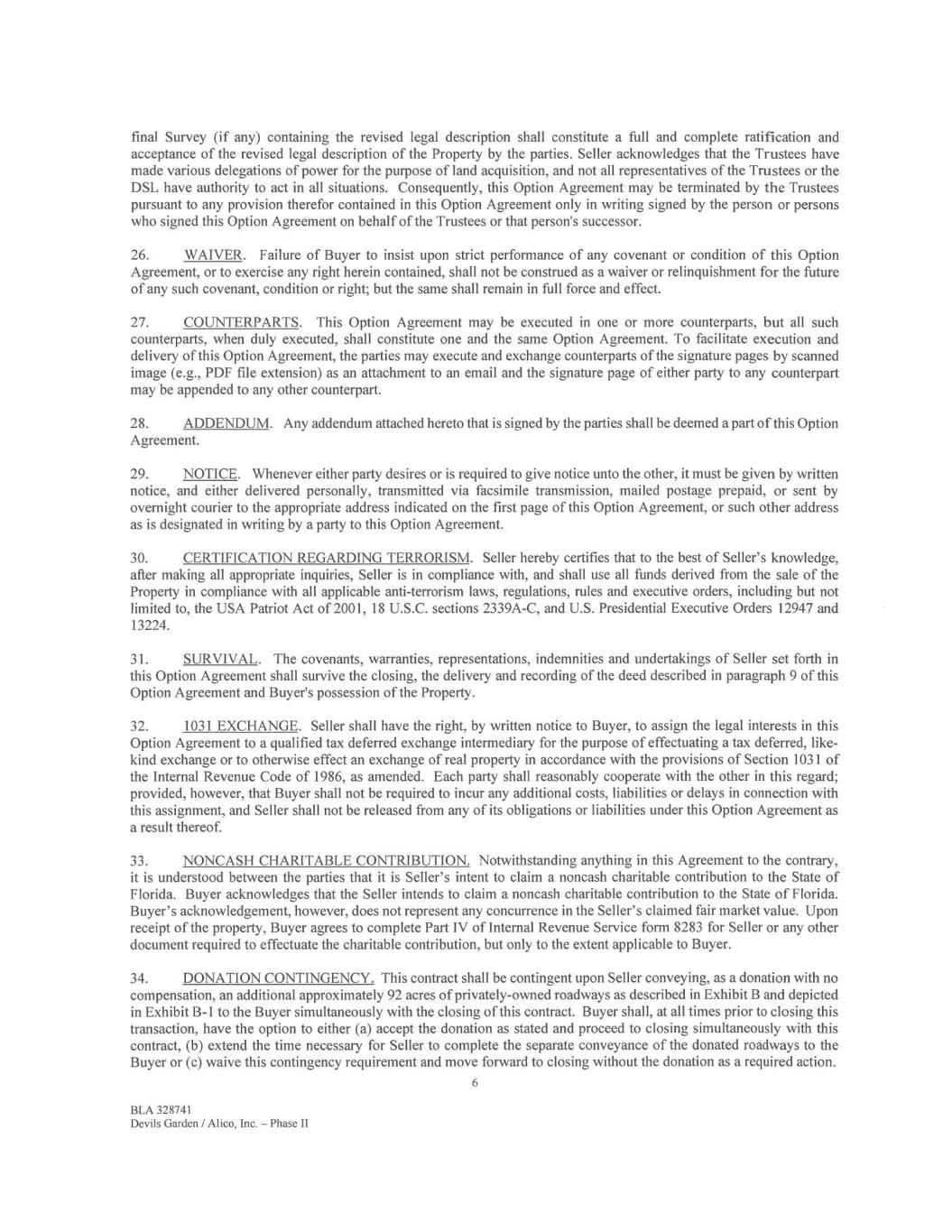 final Survey (if any) containing the revised legal description shall constitute a full and complete ratification and acceptance of the revised legal description of the Property by the parties. Seller acknowledges that the Trustees have made various delegations of power for the purpose of land acquisition, and not all representatives of the Trustees or the DSL have authority to act in all situations. Consequently, this Option Agreement may be terminated by the Trustees pursuant to any provision therefor contained in this Option Agreement only in writing signed by the person or persons who signed this Option Agreement on behalf of the Trustees or that person's successor. 26. WAIVER. Failure of Buyer to insist upon strict performance of any covenant or condition of this Option Agreement, or to exercise any right herein contained, shall not be construed as a waiver or relinquishment for the future of any such covenant, condition or right; but the same shall remain in full force and effect. 27. COUNTERPARTS. This Option Agreement may be executed in one or more counterparts, but all such counterparts, when duly executed, shall constitute one and the same Option Agreement. To facilitate execution and delivery of this Option Agreement, the parties may execute and exchange counterparts of the signature pages by scanned image (e.g., PDF file extension) as an attachment to an email and the signature page of either party to any counterpart may be appended to any other counterpart. 28. ADDENDUM. Any addendum attached hereto that is signed by the parties shall be deemed a part of this Option Agreement. 29. NOTICE. Whenever either party desires or is required to give notice unto the other, it must be given by written notice, and either delivered personally, transmitted via facsimile transmission, mailed postage prepaid, or sent by overnight courier to the appropriate address indicated on the first page of this Option Agreement, or such other address as is designated in writing by a party to this Option Agreement. 30. CERTIFICATION REGARDING TERRORISM. Seller hereby certifies that to the best of Seller's knowledge, after making all appropriate inquiries, Seller is in compliance with, and shall use all funds derived from the sale of the Property in compliance with all applicable anti-terrorism laws, regulations, rules and executive orders, including but not limited to, the USA Patriot Act of 2001, 18 U.S.C. sections 2339A-C, and U.S. Presidential Executive Orders 12947 and 13224. 31. SURVIVAL. The covenants, warranties, representations, indemnities and undertakings of Seller set forth in this Option Agreement shall survive the closing, the delivery and recording of the deed described in paragraph 9 of this Option Agreement and Buyer's possession of the Property. 32. 1031 EXCHANGE. Seller shall have the right, by written notice to Buyer, to assign the legal interests in this Option Agreement to a qualified tax deferred exchange intermediary for the purpose of effectuating a tax deferred, like- kind exchange or to otherwise effect an exchange of real property in accordance with the provisions of Section 1031 of the Internal Revenue Code of 1986, as amended. Each party shall reasonably cooperate with the other in this regard; provided, however, that Buyer shall not be required to incur any additional costs, liabilities or delays in connection with this assignment, and Seller shall not be released from any of its obligations or liabilities under this Option Agreement as a result thereof. 33. NONCASH CHARITABLE CONTRIBUTION. Notwithstanding anything in this Agreement to the contrary, it is understood between the parties that it is Seller's intent to claim a noncash charitable contribution to the State of Florida. Buyer acknowledges that the Seller intends to claim a noncash charitable contribution to the State of Florida. Buyer's acknowledgement, however, does not represent any concurrence in the Seller's claimed fair market value. Upon receipt of the property, Buyer agrees to complete Part IV of Internal Revenue Service form 8283 for Seller or any other document required to effectuate the charitable contribution, but only to the extent applicable to Buyer. 34. DONATION CONTINGENCY. This contract shall be contingent upon Seller conveying, as a donation with no compensation, an additional approximately 92 acres of privately-owned roadways as described in Exhibit B and depicted in Exhibit B-1 to the Buyer simultaneously with the closing of this contract. Buyer shall, at all times prior to closing this transaction, have the option to either (a) accept the donation as stated and proceed to closing simultaneously with this contract, (b) extend the time necessary for Seller to complete the separate conveyance of the donated roadways to the Buyer or (c) waive this contingency requirement and move forward to closing without the donation as a required action. 6 BLA 328741 Devils Garden / Alico, Inc. — Phase II