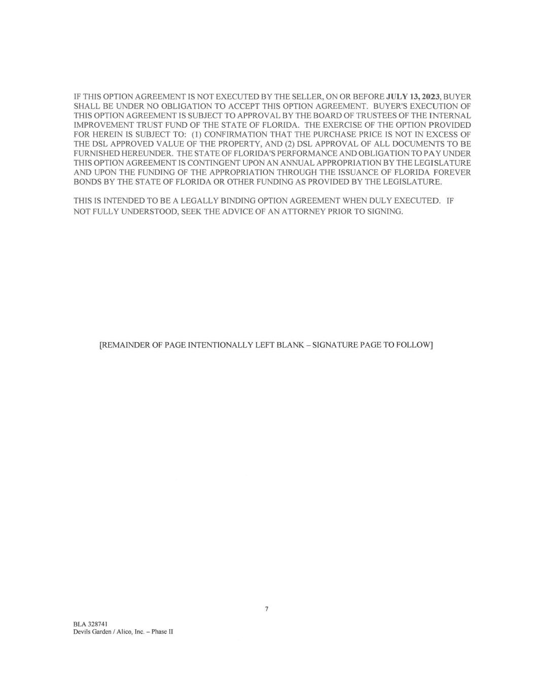 IF THIS OPTION AGREEMENT IS NOT EXECUTED BY THE SELLER, ON OR BEFORE JULY 13,2023, BUYER SHALL BE UNDER NO OBLIGATION TO ACCEPT THIS OPTION AGREEMENT. BUYER'S EXECUTION OF THIS OPTION AGREEMENT IS SUBJECT TO APPROVAL BY THE BOARD OF TRUSTEES OF THE INTERNAL IMPROVEMENT TRUST FUND OF THE STATE OF FLORIDA. THE EXERCISE OF THE OPTION PROVIDED FOR HEREIN IS SUBJECT TO: (I) CONFIRMATION THAT THE PURCHASE PRICE IS NOT IN EXCESS OF THE DSL APPROVED VALUE OF THE PROPERTY, AND (2) DSL APPROVAL OF ALL DOCUMENTS TO BE FURNISHED HEREUNDER. THE STATE OF FLORIDA'S PERFORMANCE AND OBLIGATION TO PAY UNDER THIS OPTION AGREEMENT IS CONTINGENT UPON AN ANNUAL APPROPRIATION BY THE LEGISLATURE AND UPON THE FUNDING OF THE APPROPRIATION THROUGH THE ISSUANCE OF FLORIDA FOREVER BONDS BY THE STATE OF FLORIDA OR OTHER FUNDING AS PROVIDED BY THE LEGISLATURE. THIS IS INTENDED TO BE A LEGALLY BINDING OPTION AGREEMENT WHEN DULY EXECUTED. IF NOT FULLY UNDERSTOOD, SEEK THE ADVICE OF AN ATTORNEY PRIOR TO SIGNING. [REMAINDER OF PAGE INTENTIONALLY LEFT BLANK - SIGNATURE PAGE TO FOLLOW] 7 BLA 328741 Devils Garden / Alico, Inc. — Phase II
