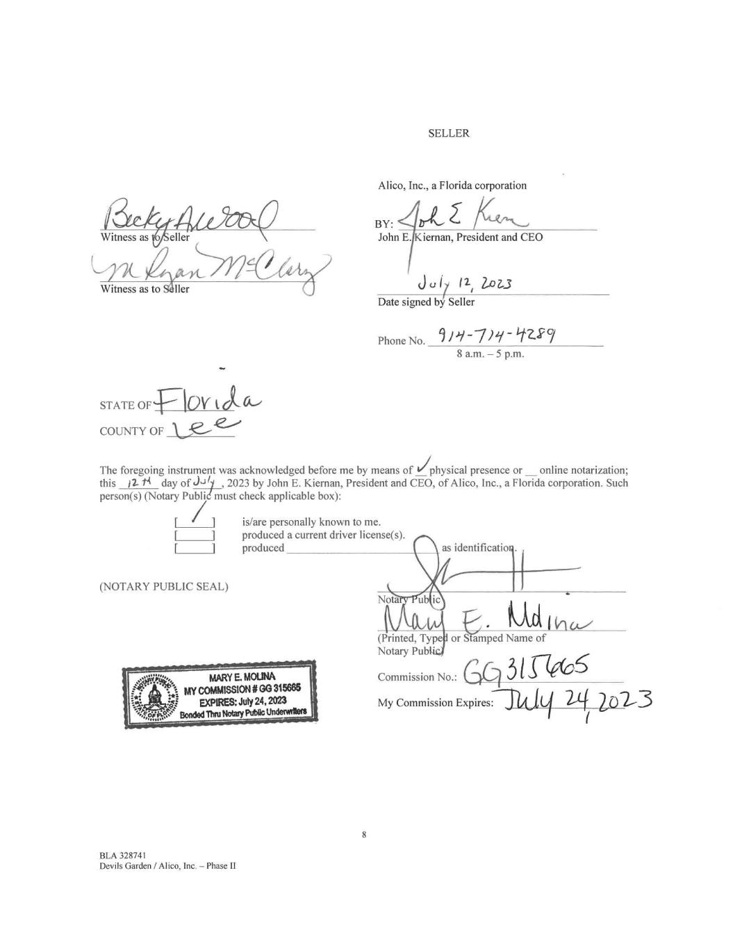 eller Witness as to Sailer SELLER Alico, Inc., a Florida corporation BY: /it John E. Kiernan, President and CEO 3u17 11' lo1.3 Date signed by Seller Phone No. 11-7)2/- 1227 8 a.m. — 5 p.m. STATE OF COUNTY OF The foregoing instrument was acknowledged before me by means of 'physical presence or online notarization; this j2- ti day of J-3y , 2023 by John E. Kiernan, President and CEO, of Alico, Inc., a Florida corporation. Such person(s) (Notary Publi must check applicable box): rr (NOTARY PUBLIC SEAL) BLA 328741 Devils Garden / Alico, Inc. — Phase II is/are personally known to me. produced a current driver license(s). produced 8 Nota as identification (Printed, Type or S amped Name of Notary Pub CCommission No.: My Commission Expires: I 3 1 De(06 "2,3