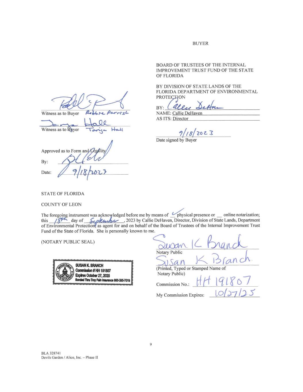 Witness as to Buyer Witness ase-tOlgi; Approved as to Form an ity By: it Date: STATE OF FLORIDA COUNTY OF LEON BUYER BOARD OF TRUSTEES OF THE INTERNAL IMPROVEMENT TRUST FUND OF THE STATE OF FLORIDA BY DIVISION OF STATE LANDS OF THE FLORIDA DEPARTMENT OF ENVIRONMENTAL PROTEON BY: Aete—e. NAME: Callie DeHaven AS ITS: Director 17/8/20 3 Date signed by Buyer The foregoing instrument was ackno ledged before me by means of _ physical presence or online notarization; this day of , 2023 by Callie DeHaven, Director, Division of State Lands, Department of Environmental Protection as agent for and on behalf of the Board of Trustees of the Internal Improvement Trust Fund of the State of Florida. She is personally known to me. (NOTARY PUBLIC SEAL) 9 BLA 328741 Devils Garden / Alico, Inc. — Phase II Sito IL Q-D,‘„,,t Notary Public SanK Pfv (Printed, Typed or Stamped Name of Notary Public) Commission No.: f(I4 Ig11.67 My Commission Expires: toia-71.25'
