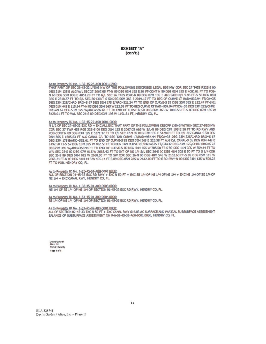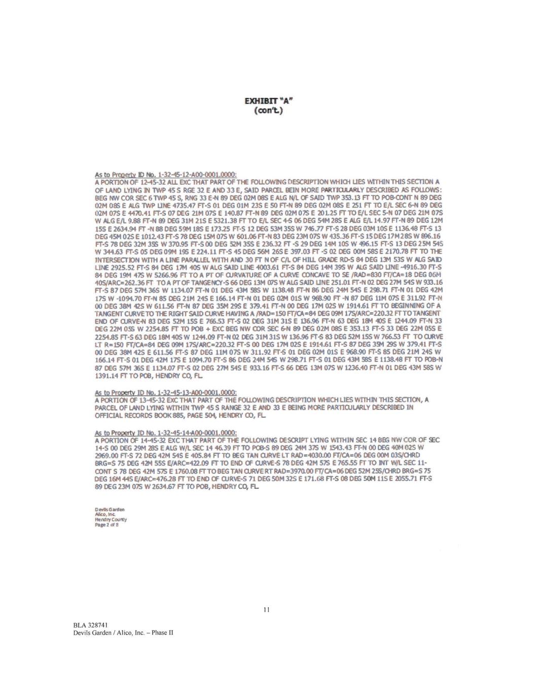 MIMT *A" (amt) As to Prooetly ID No. 1-32-45-26-A00-00010200: DtAT PART OF SEC 26-45-32 LYNG NW OF THE FOILLOWING DESCREIM LEGAL EEG 1.1iN 03R SEC 27 T455 R32E-5 00 DEG 3114 135E PLG W/L SEC 27 2067.05 FT-N 89 DEG 0314 19$ E 50 FT-CONT N 89 DEG 03/4 19$ E 4080.01 FT TO POB- N 63 DEG 5311 03S E 4851.28 FT TO N/L SEC 26 T45S R32E-4 89 DEG 0714 135 E ALG SAM N/L 9.96 FT-S 50 DEG 06/4 365 E 2818.27 FT 11;) E/.. SEC 26-CONT S 50 DEG 0611365 E 2019.17 FT TO REG CF CURVE IT RAD=839.94 FI7CA-35 DEG 33/4 22~1) BRG=S 67 DEG 5311175 E/PRCe521.24 FT TO 841) OF CURVE-S 85 DEG 324 365 E 212.47 FT -S01 DEG 0114 445 E 11534 FT-N 85 DEG 351136$ W22338 FT TO BEG CURVE RT RAD=954.94 FT/Ole---35 DEG 33M 22.5,04t0 EIRGeN 67 DEG 5314175 W/ARO--592.61 FT TO DID OF CURVE-N SO DEG 061436$ W 180533 FT-S 89 DEG 07M 135W 5428.01 FT TO W/L SEC 26-5 89 DEG 0314 195W 1191.31 FT, HENORY CO, FL As to Prottertv ID No. 1-32-45-27-A00-0001.0000: N 1/2 OF SEC 2745-32 EXC RO D1C ALL EXC THAT PART OF THE FCLLOW1NG MSCRP LY1NG WTTNIN SEC 27-0EG NW CCR SEC 27 TWP 45S RC£ 32E-S 00 CEG 3114 13S E 2067.05 ALG W S/L-N 89 DEG 03M 19S E 50 FT TO RD RWY MD POB-CONT N 89 DEG 0314 19$ E 5271.32 ETT() E/1 SEC 2741 89DC-G 0714 135 E 5428.01 Fr 10 dL2C2 CANAL-S 50 MG 061136$ £180533 FT ALG CANAL CX TO BEG TAN CURVE LT/RAD454.94 FT/CA-45 DEG 33/4 22.5/01RD BRG2.-S 67 DEG 53/4 175 E/ARC=592.61 FT TO END OF CUPVE-S 85 DEG 394 365 E 223.58 FT ALG C/t. CANAL-S 01 DEG 0611 E 1492.50 FT-S 57 DEG 1811 03$ W 402.50 FTTO BEG TAN CURVE RT/RAD35 FT/CA=32 DEG 2111 12S/CHRD BRG'S 73 DEG294 395 W/ARC.---358.94 FT TO END OF CURVE-5 89 DEG 4111 1.55 W 78538 FT-S 89 DEG 1114306 W 759.44 Fr ir) Witt. SEC 25-S 89 DEG 07M 01S W 2668.43 FT TO 1NT OF NS 1/4 Sil SEC 26-S 00 DEG 46M 305 E 50 Ff 10 S 1/4 COR SEC 26-S 89 DEG 0711 015W 2668.30 FT TO SW COR SEC 2641 00 DEG 48/4 54S W 2162.60 Fr-s 89 DEG 0514 11S W 2663.21 FT-N 00 DEG 41M 44 S W 495.14 FT-S 89 DEG 05/4 28S W 2612.00 FTTO E RD RWY-N 00 DEG 31M 13$ W598,25 FT TO PM, HENDRY CO, FL., .I to Proit ID No. 1-3245-Q1-A " *0001 ALL GF 9~o1-45-33 ExCRD-gWY 4- EXC N 50 FT EXC SE 1/4 Of NE 1/4 OF NE 1/4 EXC NE 1/4 OF SE 1/4 OF NE 1/4 EXCCANAL RWY, HENDRY CO, FL Ps to Pro txtw ID No. 1-33-45-01-A00-0003.0000: NE 1/4 CF SE 1/4 OF NE 1/4 OF SECttON 0145-33 EXC RO RWY, HENDRYCO, FL As to Prooecly ID No, 1-3345-01-A00-0004,0000: SE 1/4 OF NE 1/4 OF NE 1/4 OF SECTICM 0145-33 ExC RO RWY, HENDRY CO, FL As to PrOtlet1Y ID No. 1-3345-02~1.0000: ALI. OF SECTION 0245-33 EXC N 50 FT + EXC CANAL RWY 616.83 AC SURFACE AND PARTIAL SUBSURFACE ASSESSMENT BALANCE CF SUBSURFACE ~le« ON R-fr0245-33-A004001.0000, tr-ENDRY CO, FL Dekeli Gl•dan let Heft* y r.iJtmty Pabeci 13 BLA 328741 Devils Garden / Alico, Inc. - Phase II