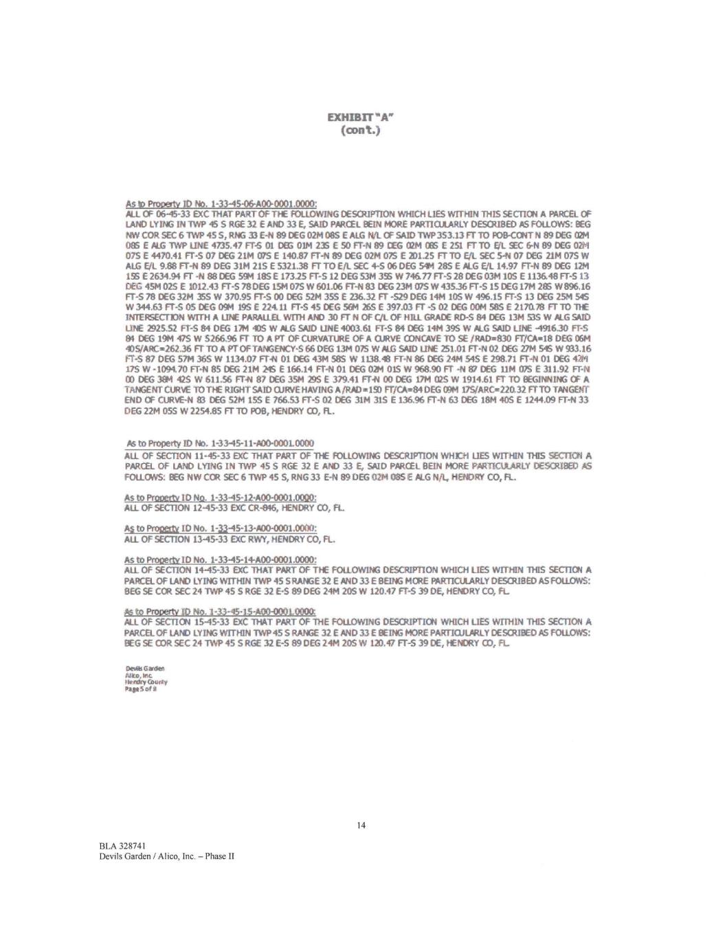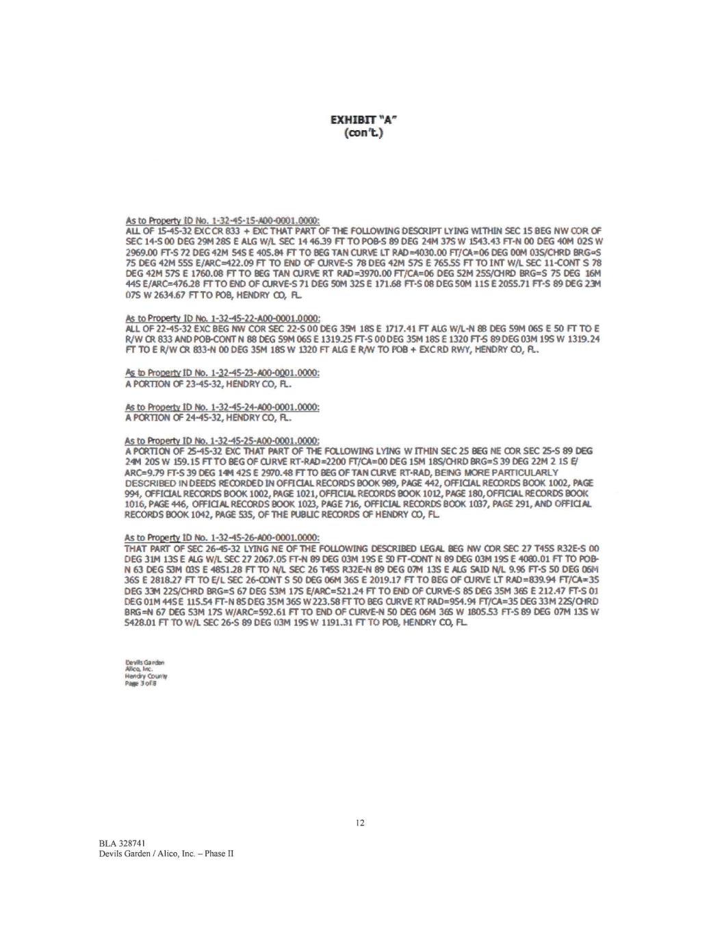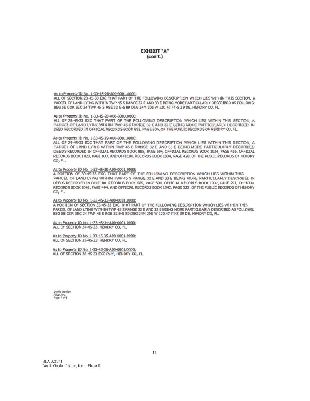 EXHIBIT "A" (Cal%) As to Prooetti ID No. 1-33-45-28-AD0-0001.12000: ALL OF SECTION 28-45-33 EXC THAT PART OF THE FOLLOWING DESCRIPTION WHICH LIES WITHIN THIS SECTION, A PARCEL OF LAND LYING WITHIN TWP 45 S RANGE 32 E AND 33 E BEING MORE PARTICULARLY DESCRIBED ik.S FOLLOWS: BEG SE COR C 241WP 45 S RGE 32 E-S 89 DEG 24M 205 W 120.47 FT-S 390€, HEMAY CO, FL P6 to Prooerty ID No. 1-33-45-28400-0003.0000: NI OF 28-45-33 EXC THAT PART OF THE FOLLOWING DESCRIPTION WHICH UES WITHIN THIS SECTION, A PARCEL OF LAND LYING WITHIN nW 455 RANGE 32 E AND 33€ BEING MORE PARTICULARLY DESCRIBED IN WED RECORDED IN OPFMAL RECORDS BOOK 8,35, PAGE 504, OF THE PUBLIC RECORDS OF HENDRY CO, P., As to Prow* ID No. 1-33-45-29400-0001.0000: ALL OF 29-45-33 RC THAT PART OF THE FOLLOWING DESCRIPTION WHICH LIES WITHIN THIS SECTION, A PARCEL OF LAND LYING WITHIN TVW 45 S RANGE 32 E AND 33 E BEING MORE PARTICULARLY DESCRIBED DEEDS RECORDED IN OFFICIAL RECORDS BOO( 885, PAGE 504, OFFICIAL RECORDS BOOK 1024, PA/SE 455, OFFICIAL RECORDS BOOK 1028, PAGE 937, AND OFFICIAL RECORDS BOOK 1034, ME 428, OF THE puetic RECORDS OF HENDRY CO, FL As to ProPettt ID No. 1-33-45-30-A00-0001.0000: A PORTION OF 30-45-33 EXC THAT PART OF THE FOLLOWING DESCRIPTION WHICH LIES WITHIN THIS PARCEL OF LAND LYING WITHIN TVVP 45 S RANGE 32 E AND 33 E BEING MORE PARTICULARLY DESCRIBED IN DEEDS RECORDED IN OFFICIAL RECORDS BOOK 88S, MX 504, OFFICIAL RECORDS BOCK 1037, PAGE 291, OFFICIAL RECORDS BOOK 1042, PAGE 494, MO OFFICIAL RECORDS BOOK 1042, PAGE 535, OF THE PUBLIC RECORDS OP HENDRY CO, FL As ta PitOeitt ID No. 1-33-45-33-A00-0001.0002: A PCRTICN OF SECTION 33-45-33 EXC THAT PART OF THE FOLLOWING DESCRIPTION WHICH LIES WITHIN THIS PARCEL OF LAND LYING vvrnim TWP 45 S RANGE 32 E AND 33€ BEING MORE PARTICULARLY DESCRIBED AS FOLLOWS BEG SE COR SEC 24 TWP 45 S RGE 32 E-S 89 DEC 24M 205 W 120.47 FT-S 39 DE, HENDRY CO, FL As to Property 11) No. 1-33-45-34A00-0001.0000; ALL OF SECTION 34-45-33, HENDRY CO, FL As to Proosty ID No. 1-33-45-35-A00-0001.0000: ALL OF SECTION 35-45-33, HENDRY CO, FL AS to Property ID No. 1-33-45-36400-0001.0000: All OF SECTION 36-45-33 INC RWY, HENDRY CO, FL Devils Gs rest Mk*. kix. Par 7 of 8 16 BLA 328741 Devils Garden / Alico, Inc. — Phase II
