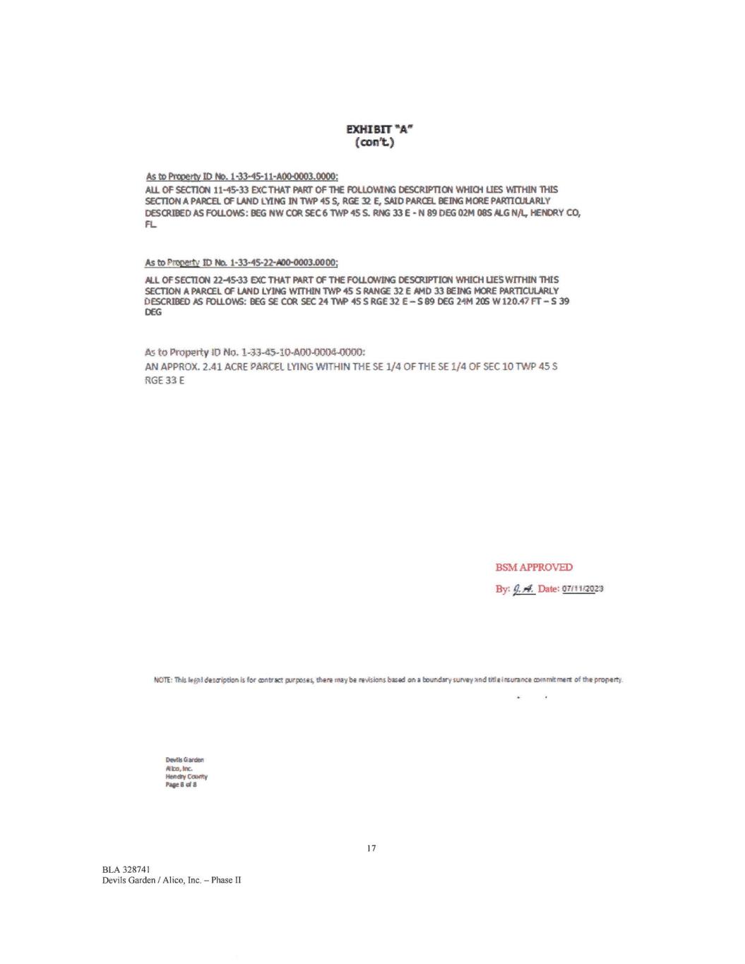 Emu BIT "A. (cont.) As to Po:petty ID No. 1-33-45-11-A00-0003.0000: ALL Of SECTION 11-45-33 EXCTHAT PART OF1HE FOLLOWING texruPnoN WHICH LIES virrHiN THIS SECTION A PARCEL OF LAND LYING ThilWP 455, RGE E, SAID PARCEL. I3EING MORE PARTICULARLY DESCRIBED AS FOLLOWS: OEG NW CM SEC 6 11NP 455. RNG 33 E - N 89 DEG 0211 08S ALA NA., HENDRY CO, FL As to Nvertv ID No. 1-33-45-22-A00-0003.0000; ALL OF SECTICN 2245-33 DX THAT PART CF THE FOLLOWING DESCRIPTION WHICH LIES WITHIN THIS SECTION A PARCEL OF LAND LYING wrnitN 1WP 45 S RANGE 32 E HID 33 BEING MORE PARTICULARLY DESCRIBED AS FOILOWS: I3EG SE COL. SEC 24 MP 45 S RGE 32 E 5 89 DEG 2114 20S W 120.47 FT — S 39 DEG A5 to Property ID No, 1-33-45-10-A00-0004-0000: AN APPROX. 2.41 ACRE PARCEL LYING WITHIN THE SE 1/4 OF THE SE 1/4 OF SEC 10 TWP 45 S RGE 33 E BSI APPROVED By.:4 Date: MI V2023 NO1E: This kf;31 description is for contrett purpose% there may be reVisions based on a boundary survey and tide insurance oonwericrneit of the property. Deans Garden aba, Inc. Heady County Page El sill 17 BLA 328741 Devils Garden / Al ico, Inc. — Phase II