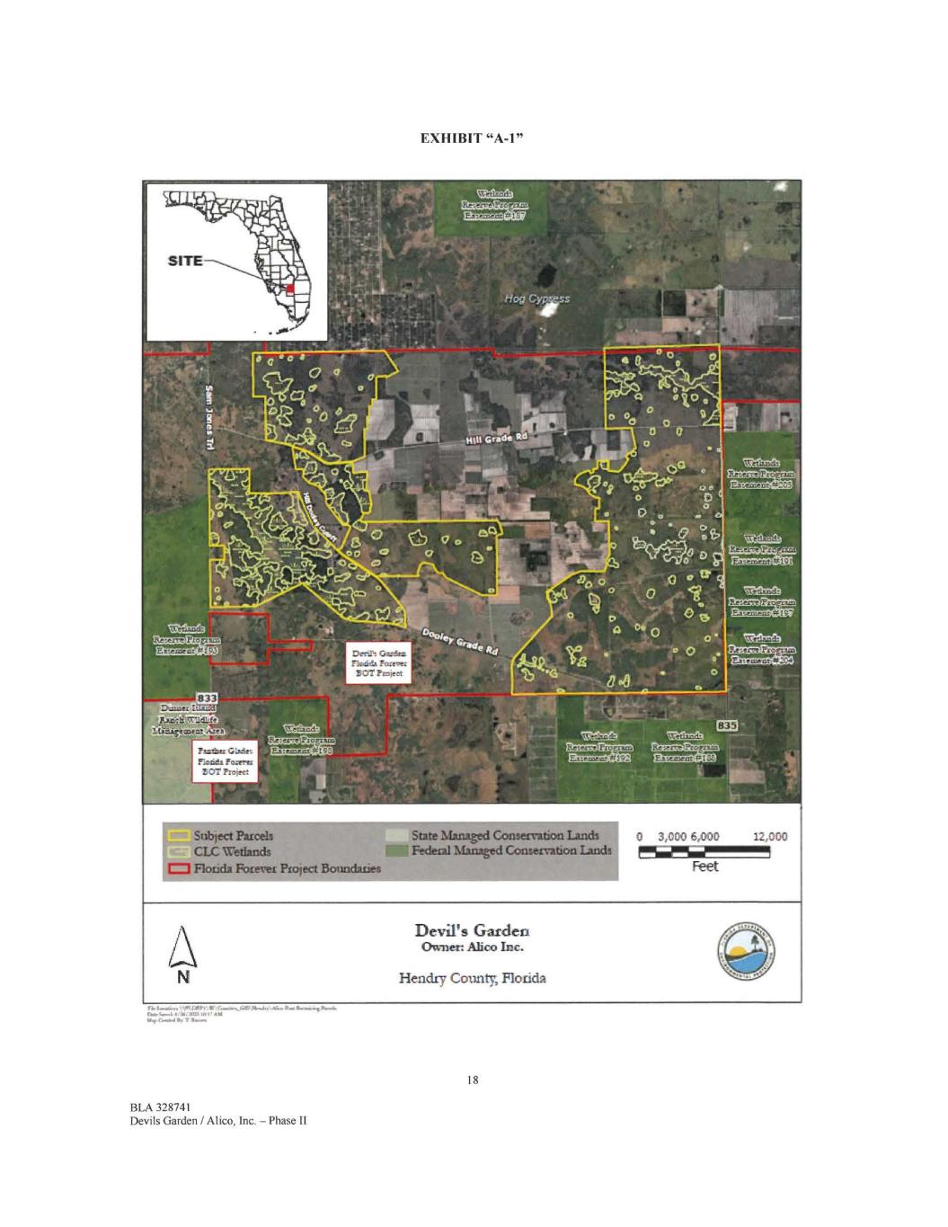EXHIBIT "A-1" Subject Parcels CLC Wetlands C=1 Florida Forever Proiect Boundaries State Managed Conservation Lands Federal Managed Conservation Lands It. AIM Ws, Gal *r 7 Ur.. 18 BLA 328741 Devils Garden / Alice, Inc. — Phase II