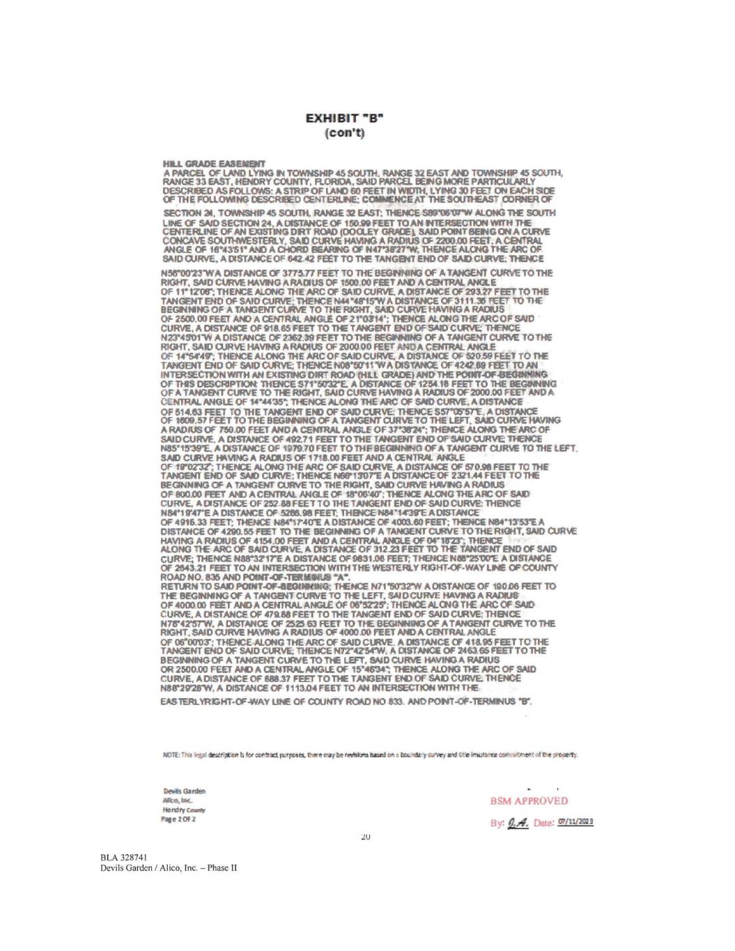 Exhibit "B" EXHIBIT "B" And also including Dooley Grade Easement Parcel and Fill Grade Easement Parcel descnInni as follow= DOOLEY GRADE EASEMENT A PARCEL. OF LAND LYING IN 1 OWNSHIP46 SOUTH, RANGE 32 EAST AND TOWNSHIP 45 SOUTH. RANGE 33 EAST, HENDRY 00UNTY, FLORIDA, SAO PARC& BONG MORE FIARTICULARLY DESMIED A.S FOLLOWS: A grow OF I *10 00 FEET IN WIDTH, LYING 30 FEET ON EACH 9 DE OPT** FIXLCANING DESCRIBED CENTERUW COM&TENCE AT THE SOUTHEAST CORNER OF SECTION 24. TOWNSHIP* SOUTH. RANGE 32 EAST; THENCE 93910607•W ALONG THE SOUTH LINE OF SAO SECTION 24, A DISTANCE OF 1$0.99 FEET TO AN INTERSECTION WITH THECENTEJRLINE OF AN EXISTING DIRT ROAD AND THE POINT.OF-GEGINNING OF THIS DESCMPTION„ SMO PONT A4800E110 A POINT ON ANONTANGINT CURVE CONCAVE SOUTTMESTERLY. SAID CURVE HAVINGA RADIUS OF 220000 FEET, A CENTRAL ANGLE Of 00101411' ANDA CHOW BEARING OF S3r1531rE; THENCE AU3010 THE PitC OF SAO CURVE, A DISTANCE Cr 1..1? FEET TO THE TANGENT ENDOF SAID CURVE 'THENCE sarovore A DISTANCE OF 2070.46 FEET TO THE BEGINNING OF A TANGENT CURVE TOTIpiE. RIGHT. SAID CURVE PAVING A RADIUS OF 1146.00 FEET NO A CENTRAL ANGLE OF 37-0119; THENCE M ONG THE ARC C/E SAID CURVE, A DISTANCE OF 739.96 FEET TO THE TANGENT END OF SAID CURVE; THENCE 8021303E A DISTANCE Of 660A4 FEET TO THE BEGINNING OF A TANGENT CURVE TOT** LEFT, SAID CURVE HAVING A RADIUS Of 723.00 FEET AND A CSYTRAL ANGLE OF 71'2421'; THENCE Al. ONG THE ARC OF SAID CURVE, A DISTANCE OF 901 DS FEET TO THE TANGENT ENDOF SAID CURVE; THENCE S73S/25-E A DISTANCE OF 307126 MET; THENCE S731413E ADISTANCE OF ierrzo FEET; THENCE S73-3016* A DISTANCE OF 266827 EEO': THENCE 6734115E A DISTANCE OF 147E01 FEET; THENCE S7e1621YE A DISTANCE OF 492.06 FEET TOTHE BEGIMING OF A TANGENT CURVE TO THE LEFT, SAO CURVE HAVING A RADIUS Of 236,00 FEET AND A CENTRAL ANGLE OF 634250`; 11ENCE ALONG THE ARC Cr SAID CURVE A DISTANCE OF 261.32 FEET 10 THE TANGENT END OF SAO CURVE THENCE 1442'0E41T A DISTANCE OF 340826 FEET: THENCE 1442'0617E A DISTANCE OF 1(tI026 WET TO THE BEGINNING OF A TANGENT CURVE TO THE ROHL SAID CuRVE HAVING A RADIUS OF 1082.00 met ANDA CENTRAL ANGLE OF 06•07136; THENCE &ONG THE ARC OF SAID CURVE, A DISTANCE Of 149.99 FEET 10 TIE TANGENT DO OF SAID CURVE THENCE N4r12.41rE A DISTANCE OF 143E94 FEET; THENCE 1444*5SO4E A DISTANCE OF 1920.56 FEET TO THE BEGINNING OF A TANGENT CURVE TO THE RIGHT, SAID CURVE HAVING A RADIUS OF 500.00 FEET AND A CENTRAL ANGLE OF 3811134*; THENCE ALONG THE ARC OF SAID CURVE, A DISTANCE OF 315_84 FEET TO THE TANGENT END OF SAID CURVE, THENICEN81'0638EA DISTANCE OF 3434.09 FEET; THENCE 14781930"E A DISTANCE OF 602564 FEET TO THE BEGINNING OF A TANGENT CURVE TO THE RIGHT, SAID CURVE HAVING A RADIUS OF 2200.00 FEET AND A MORAL ANGLE OF 10r18`23"; THENcE AU:1103 THE ARC OF SAID CURVE, A DISTANCE OF 39S .74 FEET TO THE TANGENT END OF SAID CURVE; THENCE 10313.12"StE A DISTANCE OT 343167 FEET TOM INTERSECTION Wrni THE il&ESTERLY RIGHT•OFWAY LEE OF COUNTY IROAD NO.. 835 AND POINT-OF.TERAIMIUS 11, THENCE RETURN TO SAID P0INT-CF43ECOINING AND PONT ON A CURVE CONCAVE SOUTHWESTERLY, SAID CURVE PAVING A RADIUS OF 2200.00 FEET, A.CENTRAL ANGLE OF 18'431r AND A CHORD SEARING OF 1441 .,8u W; THENCE ALONG TI-IF ARC OF SAID CURVE, A DISTANCE. OF 642.42 FEET TO THE TANGENT ENO OF SAID CURVE THENCE s56'o0r2TW A DISTANCE OF 37 /5.37 FEET TO THE BEGINNING OF &TANGENT CURVE TO THE RIGHT; SAID CURIE HAVING A RADIUS OF 1500,00 FEET AND A CENTRAL ANGLE OF 1i'12061 THENCE ALONG THE ARC OF SAID CURVE, A DISTANCE OF 203.27 FEET TO THE TANGENT END OF SAID CURVE;. THENCE 1444*413415W A DISTANCE OF 3111.30 FEET TO THE BEGINNING OF A TANGENT CURVE TO THE 1111311T, SAID CURVE HAVING A RADIUS OF 260900 FEET' AND A CENTRAL ANGLE OF 21'0314'; THENCE ALONG THE ARC OF $AID CURVE A DISTANCE OF 91865 FEETTO THE TANGENT ENDOF SAID CURVE THENCE 123*4 601"0/ A DISTANCE OF 2182.39 FEET TO THE EIEGINMNG OF A TANGENT CURVE TO THE RIGHT, SAID CURVE HAVING A RADIUS OF 2000,00 FEET AND A CENTRAL ANGLE OF 14144111-, THENCE ALONG THE ARC Of SAID CURVE, A DISTANCE OF 62059 FEET TO THE TANGENT END OF SAID CURVE; THENCE N001i0111N A DISTANCE OF 4242E9 FEET TO Art NTERSECIION WITH AN ExiSTiNG ORT ROAD 111111 GRADE) AND POINT-0/mIVROONIIS 92. Dells Gaidee, Alto, W. Plenclfy awry, Page I 012 19 BLA 328741 Devils Garden / Alico, Inc. -Phase II