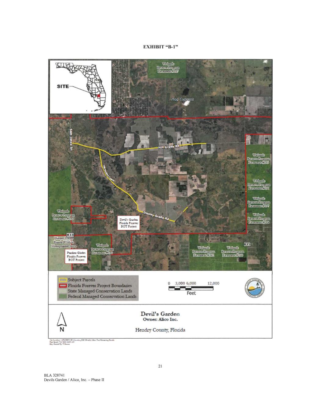 EXHIBIT "B-1" Subject Parcels Florida Forever Project Boundaries 3,000 6,000 12,00fia = State Managed Conservation Lands Feet Federal Managed Conservation Lands Devil's Garden Owner: Ahco Inc. Hendry County, Florida f &UNA. OPU21191.4‘0.4.4.1.026,04.4.,...114.1eneeioim,Pairf. riblierrodi 7.140 /611 MAI /at 114. /10, I More* 21 BLA 328741 Devils Garden / Alico, Inc. — Phase II
