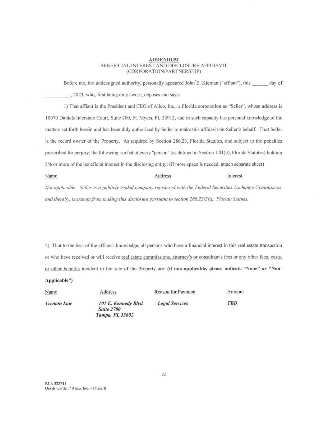 ADDENDUM BENEFICIAL INTEREST AND DISCLOSURE AFFIDAVIT (CORPORATION/PARTNERSHIP) Before me, the undersigned authority, personally appeared John.E. Kiernan ("affiant"), this day of ,2023, who, first being duly sworn, deposes and says: 1) That affiant is the President and CEO of Alico, Inc., a Florida corporation as "Seller", whose address is 10070 Daniels Interstate Court, Suite 200, Ft. Myers, FL 33913, and in such capacity has personal knowledge of the matters set forth herein and has been duly authorized by Seller to make this affidavit on Seller's behalf. That Seller is the record owner of the Property. As required by Section 286.23, Florida Statutes, and subject to the penalties prescribed for perjury, the following is a list of every "person" (as defined in Section 1.01(3), Florida Statutes) holding 5% or more of the beneficial interest in the disclosing entity: (if more space is needed, attach separate sheet) Name Address Interest Not applicable. Seller is a publicly traded company registered with the Federal Securities Exchange Commission, and thereby, is exempt from making this disclosure pursuant to section 286.23(3(a), Florida Statues. 2) That to the best of the affiant's knowledge, all persons who have a financial interest in this real estate transaction or who have received or will receive real estate commissions, attorney's or consultant's fees or any other fees, costs, or other benefits incident to the sale of the Property are: (if non-applicable, please indicate "None" or "Non - Applicable") Name Address Reason for Payment Amount Trenam Law 101 E. Kennedy Blvd. Legal Services TBD Suite 2700 Tampa, FL 33602 22 BLA 328741 Devils Garden / Alico, Inc. — Phase II