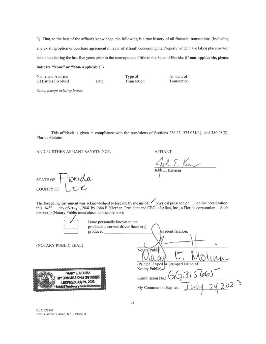 3) That, to the best of the affiant's knowledge, the following is a true history of all financial transactions (including any existing option or purchase agreement in favor of affiant) concerning the Property which have taken place or will take place during the last five years prior to the conveyance of title to the State of Florida: (if non-applicable, please indicate "None" or "Non-Applicable") Name and Address Type of Amount of Of Parties Involved Date Transaction Transaction None, except existing leases. This affidavit is given in compliance with the provisions of Sections 286.23, 375.031(1), and 380.08(2), Florida Statutes. AND FURTHER AFFIANT SAYETH NOT. STATE OF COUNTY OF AFFIANT The foregoing instrument was acknowledged before me by means of /physical presence or online notarization; this 17-'4 day ofJc. 1 , 2023 by John E. Kiernan, President and CEO, of Alico, Inc., a Florida corporation. Such person(s) (Notary Publi must check applicable box): is/are personally known to me. produced a current driver license(s). produced s identification. (NOTARY PUBLIC SEAL) 23 BLA 328741 Devils Garden / Al ico, Inc. — Phase II No ry Publi 'CA 1A/OL (Printed, Typed ir Stamped Name of Notary Publi Commission No.: GC731 S10(0) My Commission Expires: