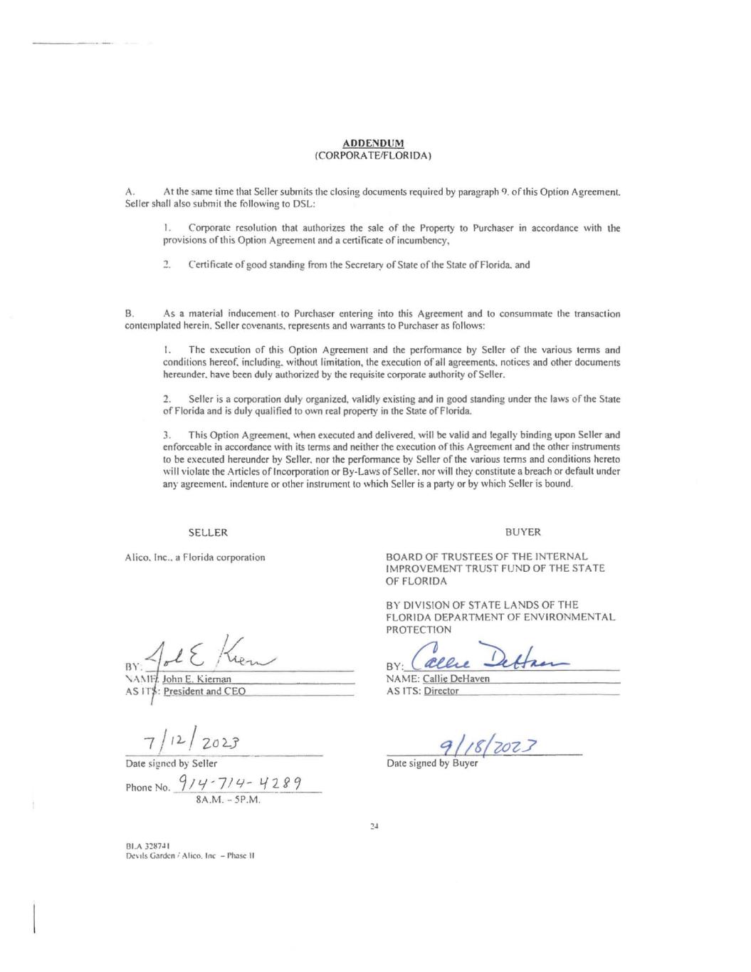 ADDENDUM (CORPORATE/FLORIDA) A. At the same time that Seller submits the closing documents required by paragraph 9. of this Option Agreement. Seller shall also submit the following to DSL: I. Corporate resolution that authorizes the sale of the Property to Purchaser in accordance with the provisions of this Option Agreement and a certificate of incumbency, 2. Certificate of good standing from the Secretary of State of the State of Florida. and B. As a material inducement. to Purchaser entering into this Agreement and to consummate the transaction contemplated herein. Seller covenants, represents and warrants to Purchaser as follows: I. The execution of this Option Agreement and the perfomiance by Seller of the various terms and conditions hereof, including, without limitation, the execution of all agreements, notices and other documents hereunder, have been duly authorized by the requisite corporate authority of Seller. 2. Seller is a corporation duly organized, validly existing and in good standing under the laws of the State of Florida and is duly qualified to own real property in the State of Florida. 3. This Option Agreement, when executed and delivered, will be valid and legally binding upon Seller and enforceable in accordance with its terms and neither the execution of this Agreement and the other instruments to be executed hereunder by Seller, nor the performance by Seller of the various terms and conditions hereto will violate the Articles of Incorporation or By-Laws of Seller. nor will they constitute a breach or default under any agreement. indenture or other instrument to which Seller is a party or by which Seller is bound. SELLER BUYER A lie°, Inc.. a Florida corporation BOARD OF TRUSTEES OF THE INTERNAL IMPROVEMENT TRUST FUND OF THE STATE OF FLORIDA BY DIVISION OF STATE LANDS OF THE FLORIDA DEPARTMENT OF ENVIRONMENTAL PROTECTION -41 E BY. BY: reeet-e- \ A MI'. John E. Kiernan NAME: Callie DeHaven AS IT.: President and CEO AS ITS: Director 7 / ZO Date signed by Seller Phone No. 9/9-7/t9-- Li 2 P 9 8A.M. - 5P.M. 131.A 328741 Devils Garden I Alico. Inc — Phase II 2-1 9//063.7 Date signed by Buyer