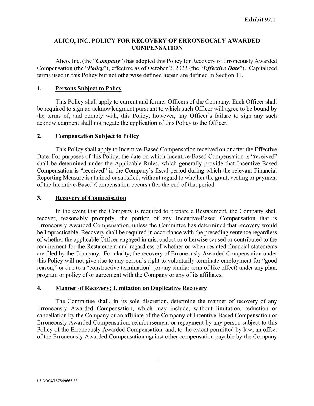 1 US-DOCS/137849666.22 ALICO, INC. POLICY FOR RECOVERY OF ERRONEOUSLY AWARDED COMPENSATION Alico, Inc. (the “Company”) has adopted this Policy for Recovery of Erroneously Awarded Compensation (the “Policy”), effective as of October 2, 2023 (the “Effective Date”). Capitalized terms used in this Policy but not otherwise defined herein are defined in Section 11. 1. Persons Subject to Policy This Policy shall apply to current and former Officers of the Company. Each Officer shall be required to sign an acknowledgment pursuant to which such Officer will agree to be bound by the terms of, and comply with, this Policy; however, any Officer’s failure to sign any such acknowledgment shall not negate the application of this Policy to the Officer. 2. Compensation Subject to Policy This Policy shall apply to Incentive-Based Compensation received on or after the Effective Date. For purposes of this Policy, the date on which Incentive-Based Compensation is “received” shall be determined under the Applicable Rules, which generally provide that Incentive-Based Compensation is “received” in the Company’s fiscal period during which the relevant Financial Reporting Measure is attained or satisfied, without regard to whether the grant, vesting or payment of the Incentive-Based Compensation occurs after the end of that period. 3. Recovery of Compensation In the event that the Company is required to prepare a Restatement, the Company shall recover, reasonably promptly, the portion of any Incentive-Based Compensation that is Erroneously Awarded Compensation, unless the Committee has determined that recovery would be Impracticable. Recovery shall be required in accordance with the preceding sentence regardless of whether the applicable Officer engaged in misconduct or otherwise caused or contributed to the requirement for the Restatement and regardless of whether or when restated financial statements are filed by the Company. For clarity, the recovery of Erroneously Awarded Compensation under this Policy will not give rise to any person’s right to voluntarily terminate employment for “good reason,” or due to a “constructive termination” (or any similar term of like effect) under any plan, program or policy of or agreement with the Company or any of its affiliates. 4. Manner of Recovery; Limitation on Duplicative Recovery The Committee shall, in its sole discretion, determine the manner of recovery of any Erroneously Awarded Compensation, which may include, without limitation, reduction or cancellation by the Company or an affiliate of the Company of Incentive-Based Compensation or Erroneously Awarded Compensation, reimbursement or repayment by any person subject to this Policy of the Erroneously Awarded Compensation, and, to the extent permitted by law, an offset of the Erroneously Awarded Compensation against other compensation payable by the Company Exhibit 97.1
