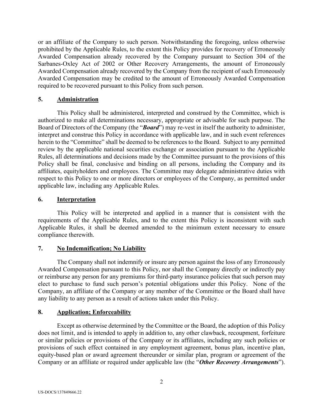 2 US-DOCS/137849666.22 or an affiliate of the Company to such person. Notwithstanding the foregoing, unless otherwise prohibited by the Applicable Rules, to the extent this Policy provides for recovery of Erroneously Awarded Compensation already recovered by the Company pursuant to Section 304 of the Sarbanes-Oxley Act of 2002 or Other Recovery Arrangements, the amount of Erroneously Awarded Compensation already recovered by the Company from the recipient of such Erroneously Awarded Compensation may be credited to the amount of Erroneously Awarded Compensation required to be recovered pursuant to this Policy from such person. 5. Administration This Policy shall be administered, interpreted and construed by the Committee, which is authorized to make all determinations necessary, appropriate or advisable for such purpose. The Board of Directors of the Company (the “Board”) may re-vest in itself the authority to administer, interpret and construe this Policy in accordance with applicable law, and in such event references herein to the “Committee” shall be deemed to be references to the Board. Subject to any permitted review by the applicable national securities exchange or association pursuant to the Applicable Rules, all determinations and decisions made by the Committee pursuant to the provisions of this Policy shall be final, conclusive and binding on all persons, including the Company and its affiliates, equityholders and employees. The Committee may delegate administrative duties with respect to this Policy to one or more directors or employees of the Company, as permitted under applicable law, including any Applicable Rules. 6. Interpretation This Policy will be interpreted and applied in a manner that is consistent with the requirements of the Applicable Rules, and to the extent this Policy is inconsistent with such Applicable Rules, it shall be deemed amended to the minimum extent necessary to ensure compliance therewith. 7. No Indemnification; No Liability The Company shall not indemnify or insure any person against the loss of any Erroneously Awarded Compensation pursuant to this Policy, nor shall the Company directly or indirectly pay or reimburse any person for any premiums for third-party insurance policies that such person may elect to purchase to fund such person’s potential obligations under this Policy. None of the Company, an affiliate of the Company or any member of the Committee or the Board shall have any liability to any person as a result of actions taken under this Policy. 8. Application; Enforceability Except as otherwise determined by the Committee or the Board, the adoption of this Policy does not limit, and is intended to apply in addition to, any other clawback, recoupment, forfeiture or similar policies or provisions of the Company or its affiliates, including any such policies or provisions of such effect contained in any employment agreement, bonus plan, incentive plan, equity-based plan or award agreement thereunder or similar plan, program or agreement of the Company or an affiliate or required under applicable law (the “Other Recovery Arrangements”).