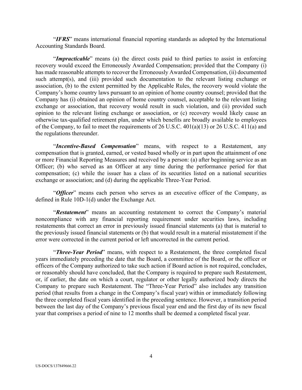 4 US-DOCS/137849666.22 “IFRS” means international financial reporting standards as adopted by the International Accounting Standards Board. “Impracticable” means (a) the direct costs paid to third parties to assist in enforcing recovery would exceed the Erroneously Awarded Compensation; provided that the Company (i) has made reasonable attempts to recover the Erroneously Awarded Compensation, (ii) documented such attempt(s), and (iii) provided such documentation to the relevant listing exchange or association, (b) to the extent permitted by the Applicable Rules, the recovery would violate the Company’s home country laws pursuant to an opinion of home country counsel; provided that the Company has (i) obtained an opinion of home country counsel, acceptable to the relevant listing exchange or association, that recovery would result in such violation, and (ii) provided such opinion to the relevant listing exchange or association, or (c) recovery would likely cause an otherwise tax-qualified retirement plan, under which benefits are broadly available to employees of the Company, to fail to meet the requirements of 26 U.S.C. 401(a)(13) or 26 U.S.C. 411(a) and the regulations thereunder. “Incentive-Based Compensation” means, with respect to a Restatement, any compensation that is granted, earned, or vested based wholly or in part upon the attainment of one or more Financial Reporting Measures and received by a person: (a) after beginning service as an Officer; (b) who served as an Officer at any time during the performance period for that compensation; (c) while the issuer has a class of its securities listed on a national securities exchange or association; and (d) during the applicable Three-Year Period. “Officer” means each person who serves as an executive officer of the Company, as defined in Rule 10D-1(d) under the Exchange Act. “Restatement” means an accounting restatement to correct the Company’s material noncompliance with any financial reporting requirement under securities laws, including restatements that correct an error in previously issued financial statements (a) that is material to the previously issued financial statements or (b) that would result in a material misstatement if the error were corrected in the current period or left uncorrected in the current period. “Three-Year Period” means, with respect to a Restatement, the three completed fiscal years immediately preceding the date that the Board, a committee of the Board, or the officer or officers of the Company authorized to take such action if Board action is not required, concludes, or reasonably should have concluded, that the Company is required to prepare such Restatement, or, if earlier, the date on which a court, regulator or other legally authorized body directs the Company to prepare such Restatement. The “Three-Year Period” also includes any transition period (that results from a change in the Company’s fiscal year) within or immediately following the three completed fiscal years identified in the preceding sentence. However, a transition period between the last day of the Company’s previous fiscal year end and the first day of its new fiscal year that comprises a period of nine to 12 months shall be deemed a completed fiscal year.