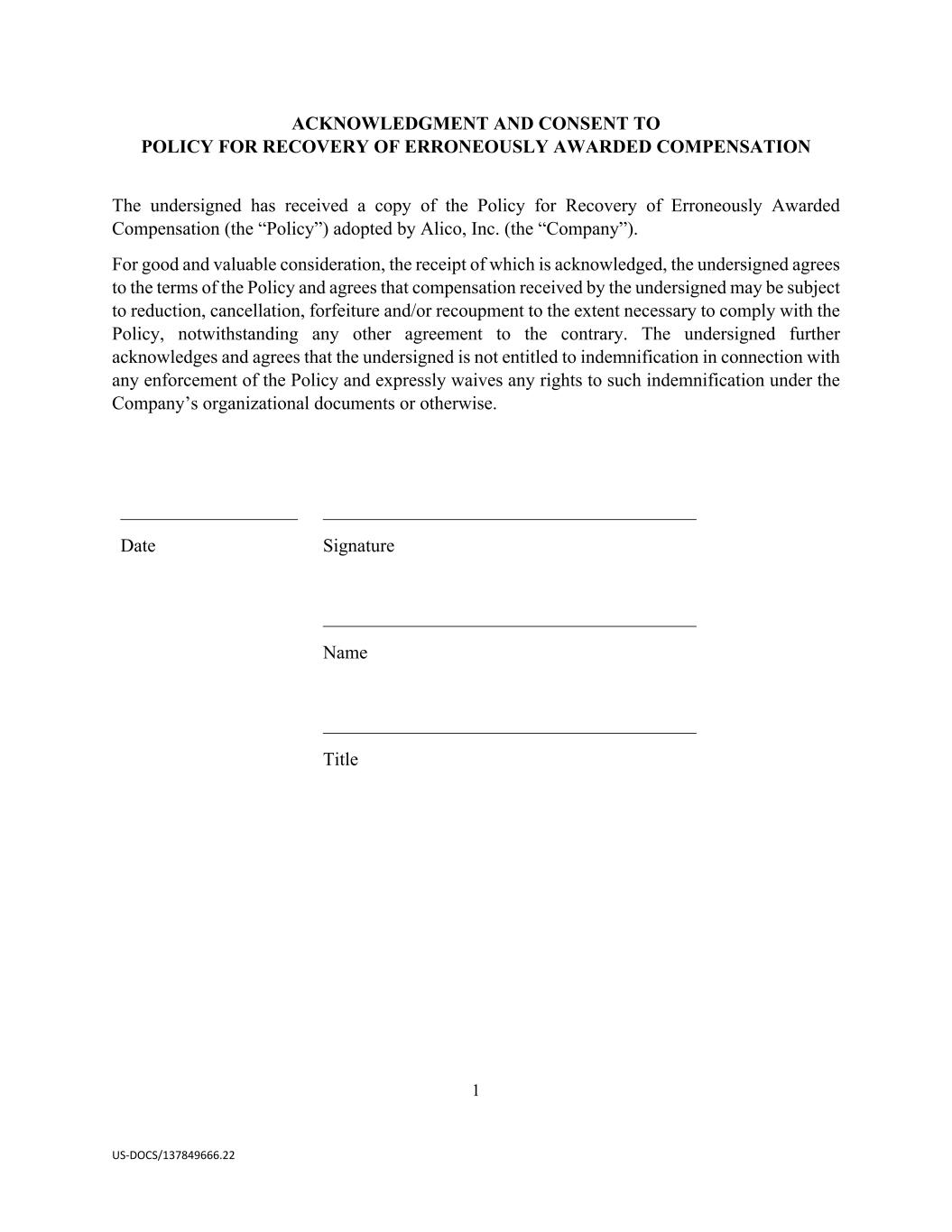1 US-DOCS/137849666.22 ACKNOWLEDGMENT AND CONSENT TO POLICY FOR RECOVERY OF ERRONEOUSLY AWARDED COMPENSATION The undersigned has received a copy of the Policy for Recovery of Erroneously Awarded Compensation (the “Policy”) adopted by Alico, Inc. (the “Company”). For good and valuable consideration, the receipt of which is acknowledged, the undersigned agrees to the terms of the Policy and agrees that compensation received by the undersigned may be subject to reduction, cancellation, forfeiture and/or recoupment to the extent necessary to comply with the Policy, notwithstanding any other agreement to the contrary. The undersigned further acknowledges and agrees that the undersigned is not entitled to indemnification in connection with any enforcement of the Policy and expressly waives any rights to such indemnification under the Company’s organizational documents or otherwise. ___________________ Date ________________________________________ Signature ________________________________________ Name ________________________________________ Title