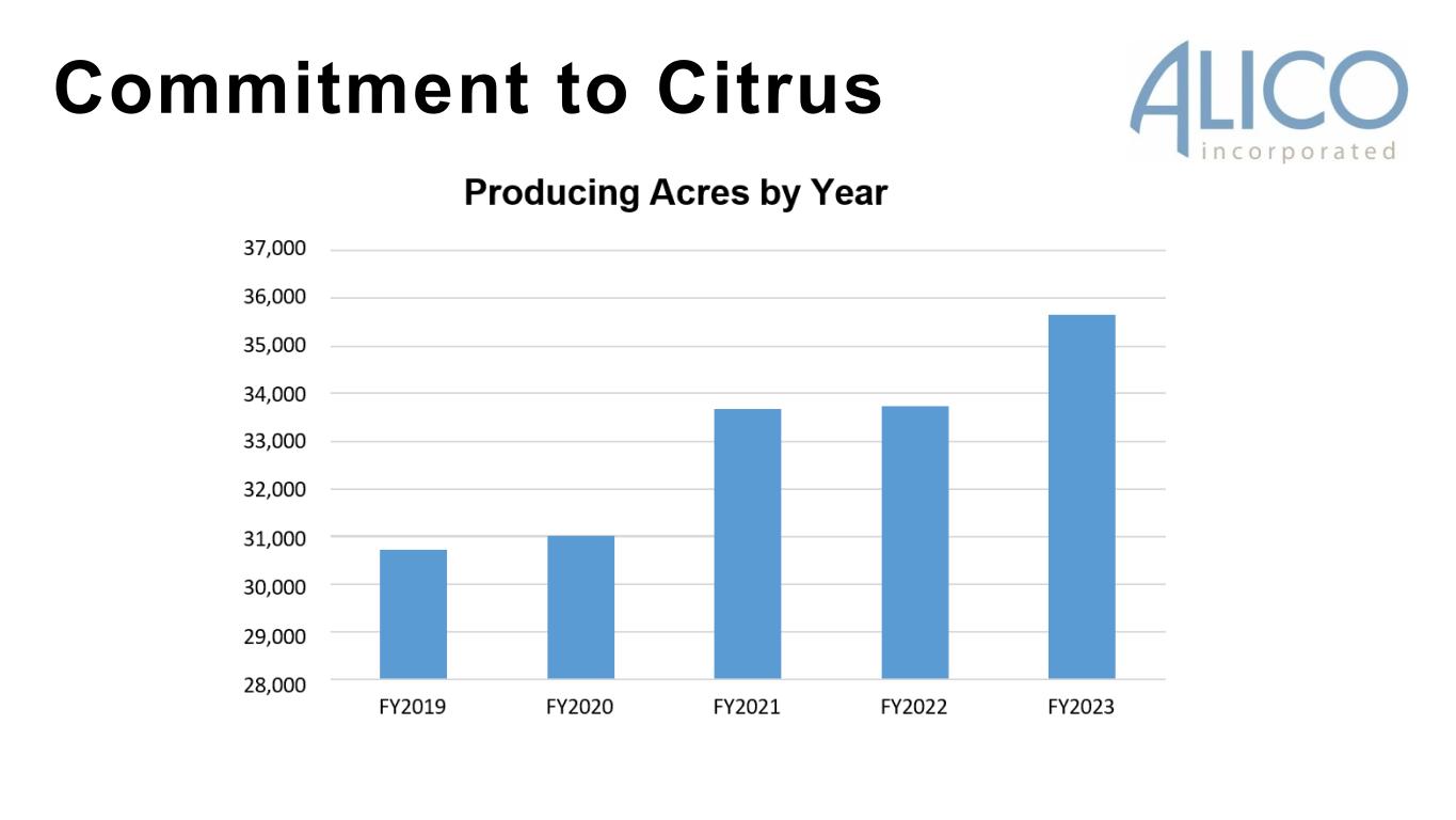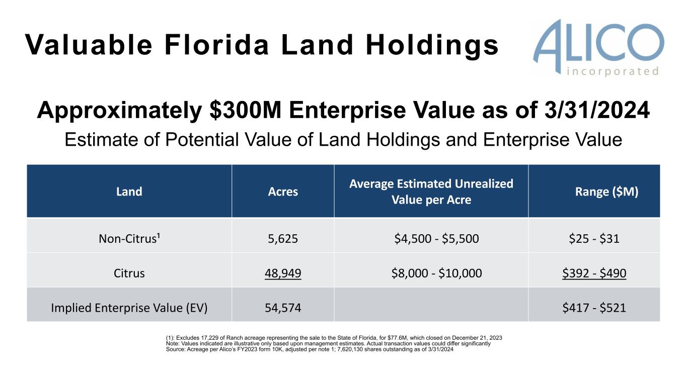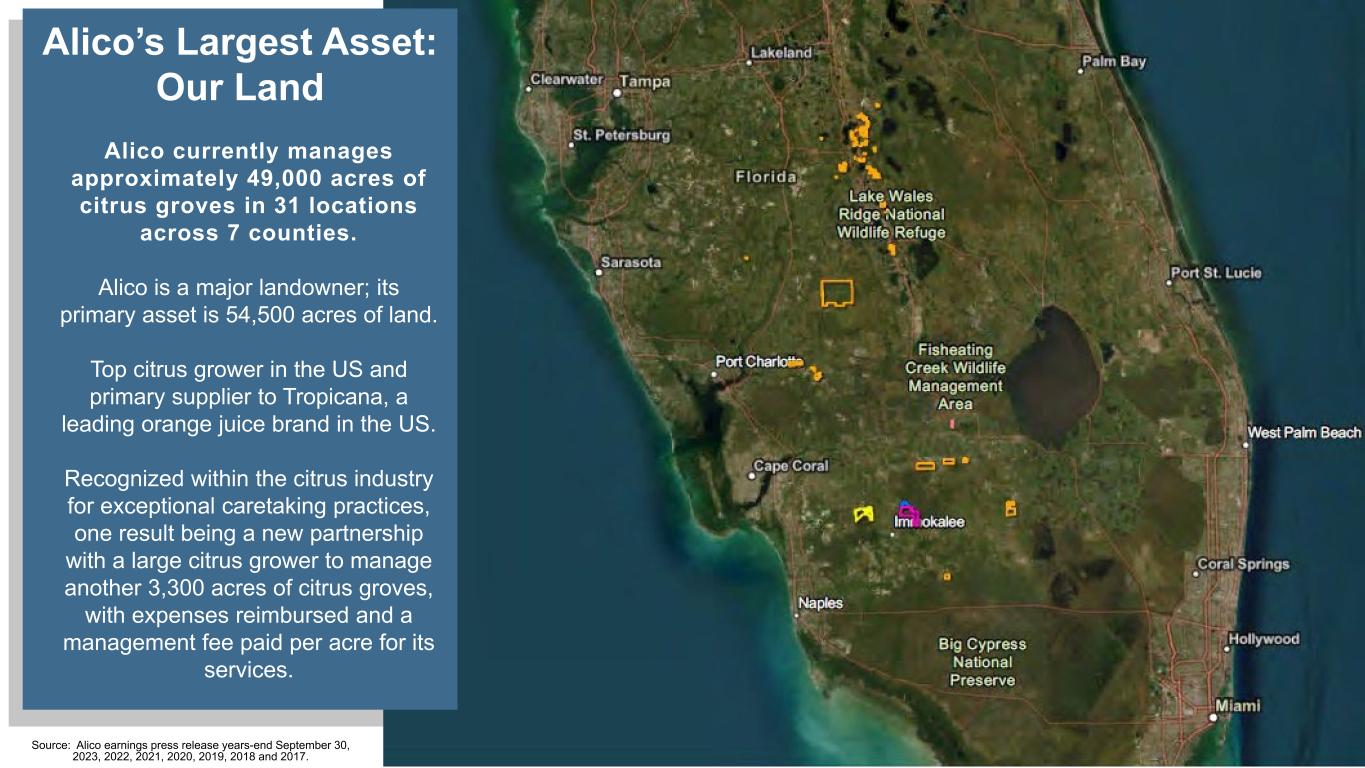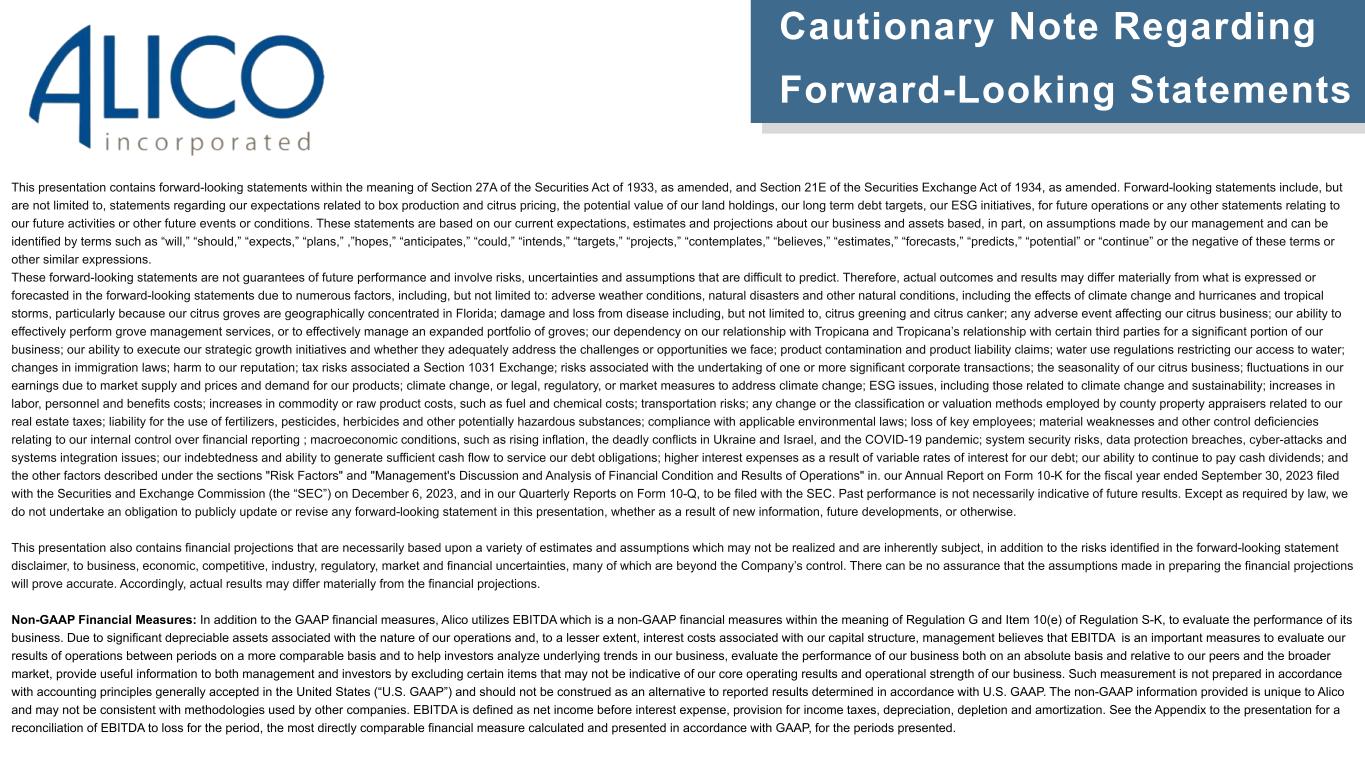 Cautionary Note Regarding Forward-Looking Statements This presentation contains forward-looking statements within the meaning of Section 27A of the Securities Act of 1933, as amended, and Section 21E of the Securities Exchange Act of 1934, as amended. Forward-looking statements include, but are not limited to, statements regarding our expectations related to box production and citrus pricing, the potential value of our land holdings, our long term debt targets, our ESG initiatives, for future operations or any other statements relating to our future activities or other future events or conditions. These statements are based on our current expectations, estimates and projections about our business and assets based, in part, on assumptions made by our management and can be identified by terms such as “will,” “should,” “expects,” “plans,” ,”hopes,” “anticipates,” “could,” “intends,” “targets,” “projects,” “contemplates,” “believes,” “estimates,” “forecasts,” “predicts,” “potential” or “continue” or the negative of these terms or other similar expressions. These forward-looking statements are not guarantees of future performance and involve risks, uncertainties and assumptions that are difficult to predict. Therefore, actual outcomes and results may differ materially from what is expressed or forecasted in the forward-looking statements due to numerous factors, including, but not limited to: adverse weather conditions, natural disasters and other natural conditions, including the effects of climate change and hurricanes and tropical storms, particularly because our citrus groves are geographically concentrated in Florida; damage and loss from disease including, but not limited to, citrus greening and citrus canker; any adverse event affecting our citrus business; our ability to effectively perform grove management services, or to effectively manage an expanded portfolio of groves; our dependency on our relationship with Tropicana and Tropicana’s relationship with certain third parties for a significant portion of our business; our ability to execute our strategic growth initiatives and whether they adequately address the challenges or opportunities we face; product contamination and product liability claims; water use regulations restricting our access to water; changes in immigration laws; harm to our reputation; tax risks associated a Section 1031 Exchange; risks associated with the undertaking of one or more significant corporate transactions; the seasonality of our citrus business; fluctuations in our earnings due to market supply and prices and demand for our products; climate change, or legal, regulatory, or market measures to address climate change; ESG issues, including those related to climate change and sustainability; increases in labor, personnel and benefits costs; increases in commodity or raw product costs, such as fuel and chemical costs; transportation risks; any change or the classification or valuation methods employed by county property appraisers related to our real estate taxes; liability for the use of fertilizers, pesticides, herbicides and other potentially hazardous substances; compliance with applicable environmental laws; loss of key employees; material weaknesses and other control deficiencies relating to our internal control over financial reporting ; macroeconomic conditions, such as rising inflation, the deadly conflicts in Ukraine and Israel, and the COVID-19 pandemic; system security risks, data protection breaches, cyber-attacks and systems integration issues; our indebtedness and ability to generate sufficient cash flow to service our debt obligations; higher interest expenses as a result of variable rates of interest for our debt; our ability to continue to pay cash dividends; and the other factors described under the sections "Risk Factors" and "Management's Discussion and Analysis of Financial Condition and Results of Operations" in. our Annual Report on Form 10-K for the fiscal year ended September 30, 2023 filed with the Securities and Exchange Commission (the “SEC”) on December 6, 2023, and in our Quarterly Reports on Form 10-Q, to be filed with the SEC. Past performance is not necessarily indicative of future results. Except as required by law, we do not undertake an obligation to publicly update or revise any forward-looking statement in this presentation, whether as a result of new information, future developments, or otherwise. This presentation also contains financial projections that are necessarily based upon a variety of estimates and assumptions which may not be realized and are inherently subject, in addition to the risks identified in the forward-looking statement disclaimer, to business, economic, competitive, industry, regulatory, market and financial uncertainties, many of which are beyond the Company’s control. There can be no assurance that the assumptions made in preparing the financial projections will prove accurate. Accordingly, actual results may differ materially from the financial projections. Non-GAAP Financial Measures: In addition to the GAAP financial measures, Alico utilizes EBITDA which is a non-GAAP financial measures within the meaning of Regulation G and Item 10(e) of Regulation S-K, to evaluate the performance of its business. Due to significant depreciable assets associated with the nature of our operations and, to a lesser extent, interest costs associated with our capital structure, management believes that EBITDA is an important measures to evaluate our results of operations between periods on a more comparable basis and to help investors analyze underlying trends in our business, evaluate the performance of our business both on an absolute basis and relative to our peers and the broader market, provide useful information to both management and investors by excluding certain items that may not be indicative of our core operating results an