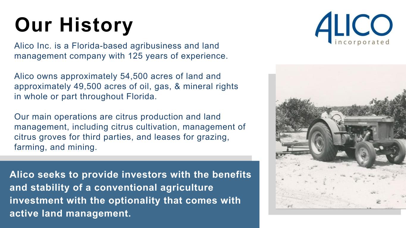 Our History Alico Inc. is a Florida-based agribusiness and land management company with 125 years of experience. Alico owns approximately 54,500 acres of land and approximately 49,500 acres of oil, gas, & mineral rights in whole or part throughout Florida. Our main operations are citrus production and land management, including citrus cultivation, management of citrus groves for third parties, and leases for grazing, farming, and mining. Alico seeks to provide investors with the benefits and stability of a conventional agriculture investment with the optionality that comes with active land management.