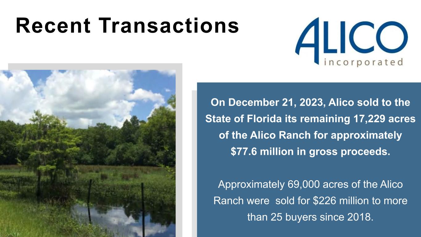 On December 21, 2023, Alico sold to the State of Florida its remaining 17,229 acres of the Alico Ranch for approximately $77.6 million in gross proceeds. Approximately 69,000 acres of the Alico Ranch were sold for $226 million to more than 25 buyers since 2018. Recent Transactions