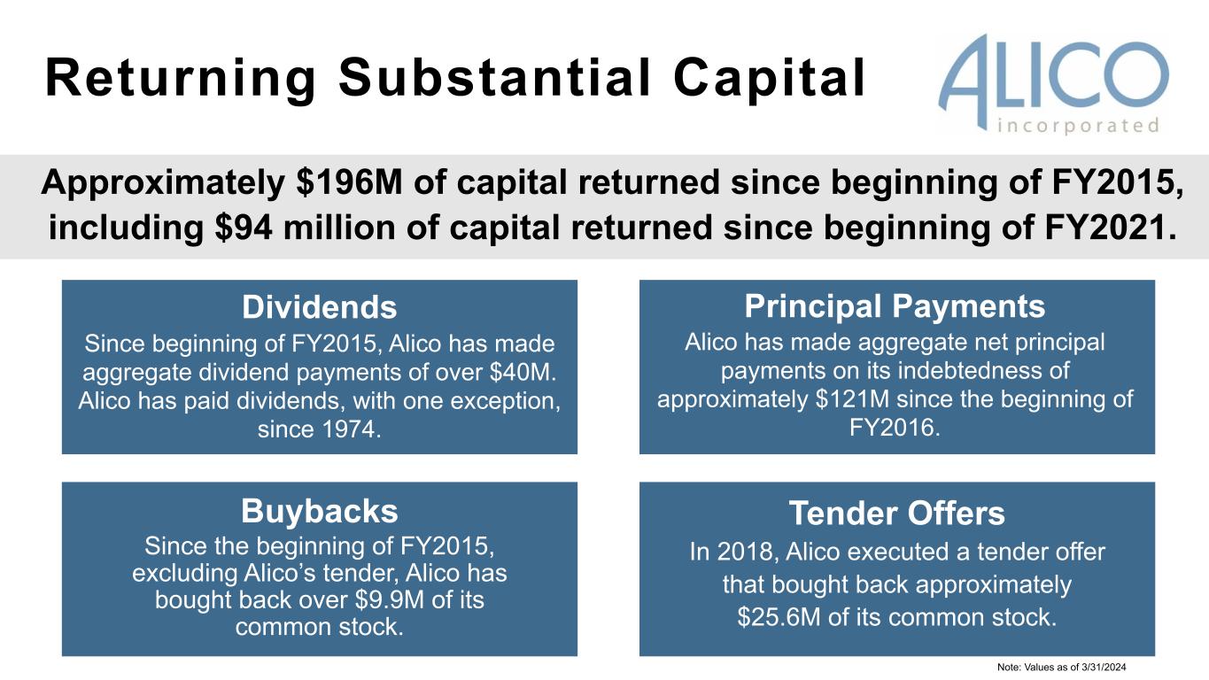 Dividends Since beginning of FY2015, Alico has made aggregate dividend payments of over $40M. Alico has paid dividends, with one exception, since 1974. Approximately $196M of capital returned since beginning of FY2015, including $94 million of capital returned since beginning of FY2021. Tender Offers In 2018, Alico executed a tender offer that bought back approximately $25.6M of its common stock. Buybacks Since the beginning of FY2015, excluding Alico’s tender, Alico has bought back over $9.9M of its common stock. Principal Payments Alico has made aggregate net principal payments on its indebtedness of approximately $121M since the beginning of FY2016. Note: Values as of 3/31/2024 Returning Substantial Capital