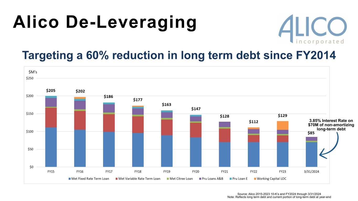 Targeting a 60% reduction in long term debt since FY2014 Source: Alico 2015-2023 10-K’s and FY2024 through 3/31/2024 Note: Reflects long term debt and current portion of long-term debt at year-end 3.85% Interest Rate on $70M of non-amortizing long-term debt Alico De-Leveraging