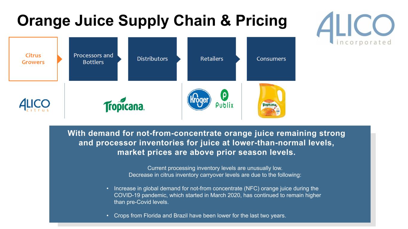 Orange Juice Supply Chain & Pricing With demand for not-from-concentrate orange juice remaining strong and processor inventories for juice at lower-than-normal levels, market prices are above prior season levels. Current processing inventory levels are unusually low. Decrease in citrus inventory carryover levels are due to the following: • Increase in global demand for not-from concentrate (NFC) orange juice during the COVID-19 pandemic, which started in March 2020, has continued to remain higher than pre-Covid levels. • Crops from Florida and Brazil have been lower for the last two years.