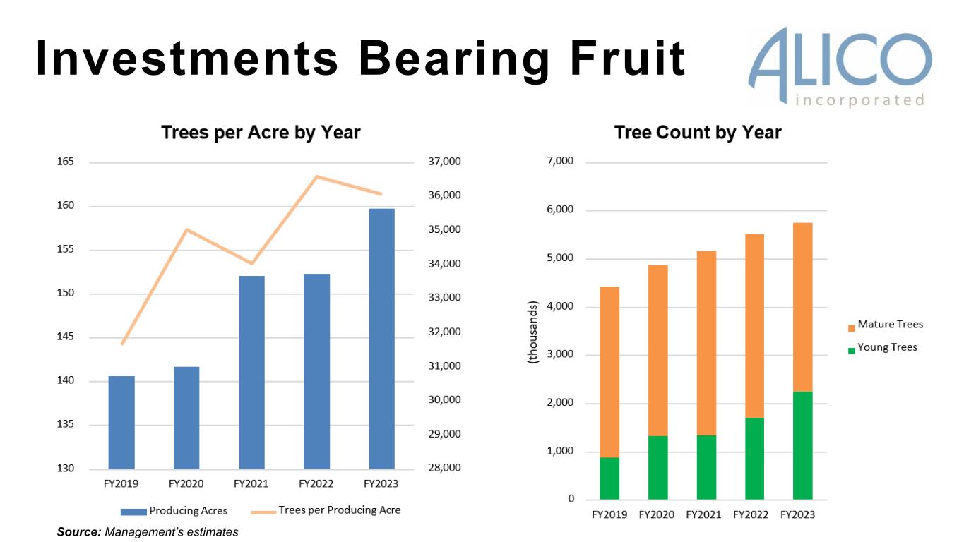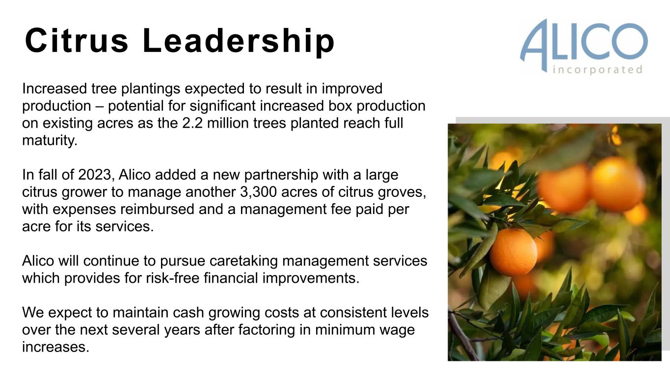 Citrus Leadership Increased tree plantings expected to result in improved production – potential for significant increased box production on existing acres as the 2.2 million trees planted reach full maturity. In fall of 2023, Alico added a new partnership with a large citrus grower to manage another 3,300 acres of citrus groves, with expenses reimbursed and a management fee paid per acre for its services. Alico will continue to pursue caretaking management services which provides for risk-free financial improvements. We expect to maintain cash growing costs at consistent levels over the next several years after factoring in minimum wage increases.