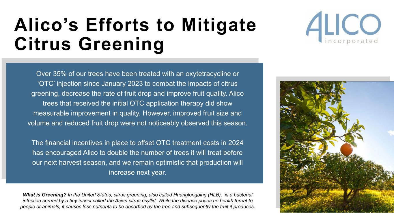 Alico’s Efforts to Mitigate Citrus Greening Over 35% of our trees have been treated with an oxytetracycline or ‘OTC’ injection since January 2023 to combat the impacts of citrus greening, decrease the rate of fruit drop and improve fruit quality. Alico trees that received the initial OTC application therapy did show measurable improvement in quality. However, improved fruit size and volume and reduced fruit drop were not noticeably observed this season. The financial incentives in place to offset OTC treatment costs in 2024 has encouraged Alico to double the number of trees it will treat before our next harvest season, and we remain optimistic that production will increase next year. What is Greening? In the United States, citrus greening, also called Huanglongbing (HLB), is a bacterial infection spread by a tiny insect called the Asian citrus psyllid. While the disease poses no health threat to people or animals, it causes less nutrients to be absorbed by the tree and subsequently the fruit it produces.