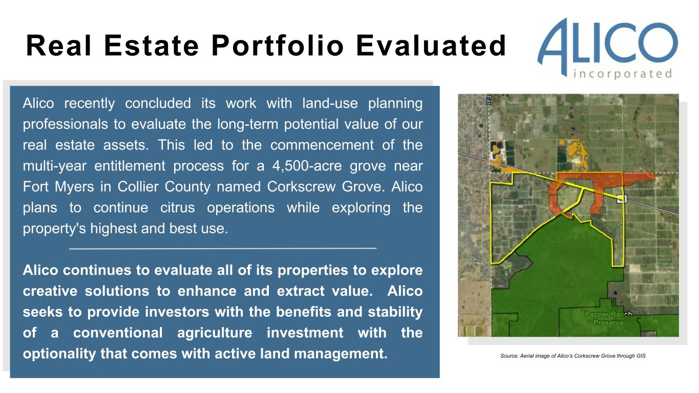 Alico recently concluded its work with land-use planning professionals to evaluate the long-term potential value of our real estate assets. This led to the commencement of the multi-year entitlement process for a 4,500-acre grove near Fort Myers in Collier County named Corkscrew Grove. Alico plans to continue citrus operations while exploring the property's highest and best use. Alico continues to evaluate all of its properties to explore creative solutions to enhance and extract value. Alico seeks to provide investors with the benefits and stability of a conventional agriculture investment with the optionality that comes with active land management. Real Estate Portfolio Evaluated Source: Aerial image of Alico’s Corkscrew Grove through GIS