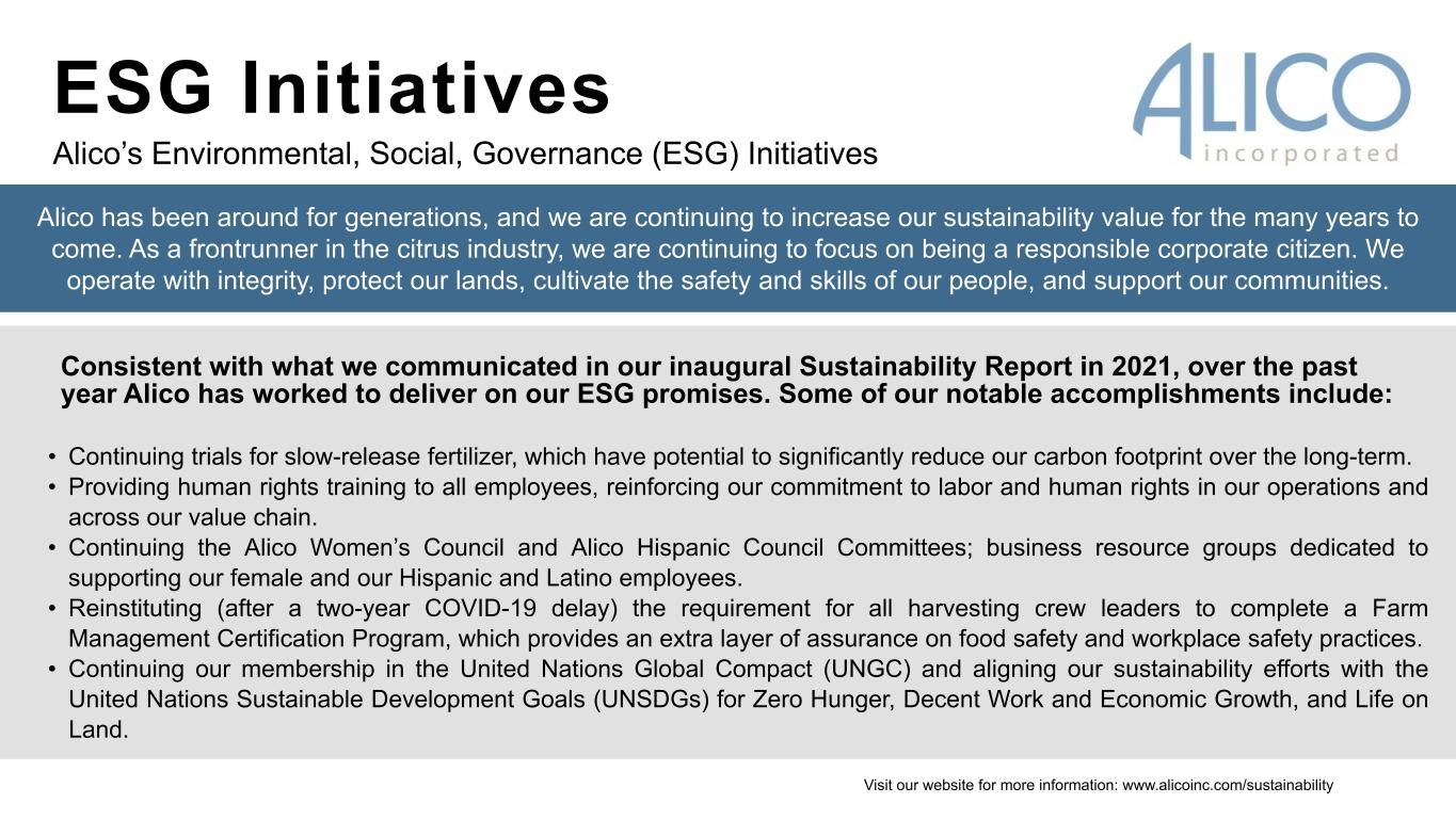 Consistent with what we communicated in our inaugural Sustainability Report in 2021, over the past year Alico has worked to deliver on our ESG promises. Some of our notable accomplishments include: Visit our website for more information: www.alicoinc.com/sustainability Alico’s Environmental, Social, Governance (ESG) Initiatives • Continuing trials for slow-release fertilizer, which have potential to significantly reduce our carbon footprint over the long-term. • Providing human rights training to all employees, reinforcing our commitment to labor and human rights in our operations and across our value chain. • Continuing the Alico Women’s Council and Alico Hispanic Council Committees; business resource groups dedicated to supporting our female and our Hispanic and Latino employees. • Reinstituting (after a two-year COVID-19 delay) the requirement for all harvesting crew leaders to complete a Farm Management Certification Program, which provides an extra layer of assurance on food safety and workplace safety practices. • Continuing our membership in the United Nations Global Compact (UNGC) and aligning our sustainability efforts with the United Nations Sustainable Development Goals (UNSDGs) for Zero Hunger, Decent Work and Economic Growth, and Life on Land. ESG Initiatives Alico has been around for generations, and we are continuing to increase our sustainability value for the many years to come. As a frontrunner in the citrus industry, we are continuing to focus on being a responsible corporate citizen. We operate with integrity, protect our lands, cultivate the safety and skills of our people, and support our communities.