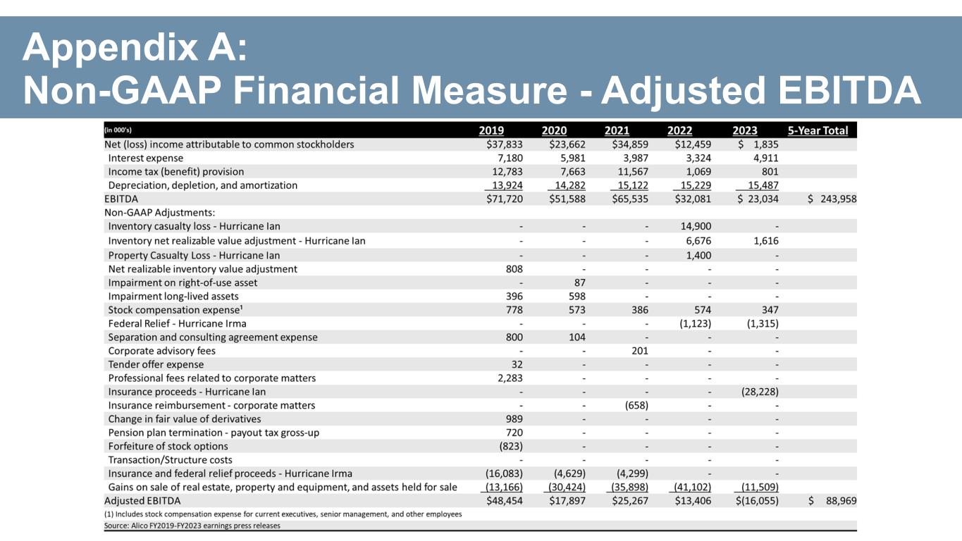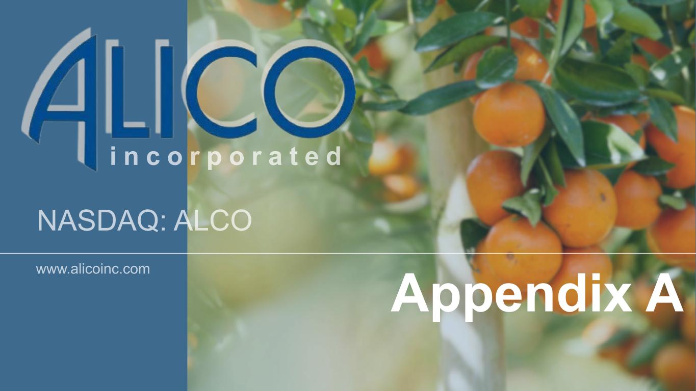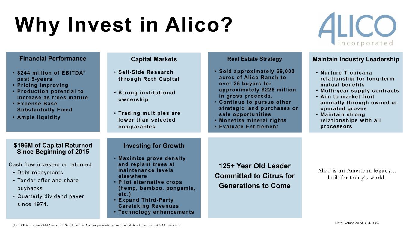 Maintain Industry Leadership • Nurture Tropicana relationship for long-term mutual benefits • Multi-year supply contracts • Aim to market fruit annually through owned or operated groves • Maintain strong relationships with all processors 125+ Year Old Leader Committed to Citrus for Generations to Come Investing for Growth • Maximize grove density and replant trees at maintenance levels elsewhere • Pilot alternative crops (hemp, bamboo, pongamia, etc.) • Expand Third-Party Caretaking Revenues • Technology enhancements $196M of Capital Returned Since Beginning of 2015 Cash f low invested or returned: • Debt repayments • Tender offer and share buybacks • Quarterly dividend payer since 1974. Financial Performance • $244 million of EBITDA* past 5-years • Pricing improving • Production potential to increase as trees mature • Expense Base Substantially Fixed • Ample liquidity Capital Markets • Sell-Side Research through Roth Capital • Strong institut ional ownership • Trading mult iples are lower than selected comparables Real Estate Strategy • Sold approximately 69,000 acres of Alico Ranch to over 25 buyers for approximately $226 million in gross proceeds. • Continue to pursue other strategic land purchases or sale opportunities • Monetize mineral rights • Evaluate Entitlement Alico is a n Ame rica n le ga cy... built for toda y's world. Why Invest in Alico? (1) EBITDA is a non-GAAP measure . See Appendix A in this presenta tion for reconcilia tion to the neares t GAAP measure . Note: Values as of 3/31/2024