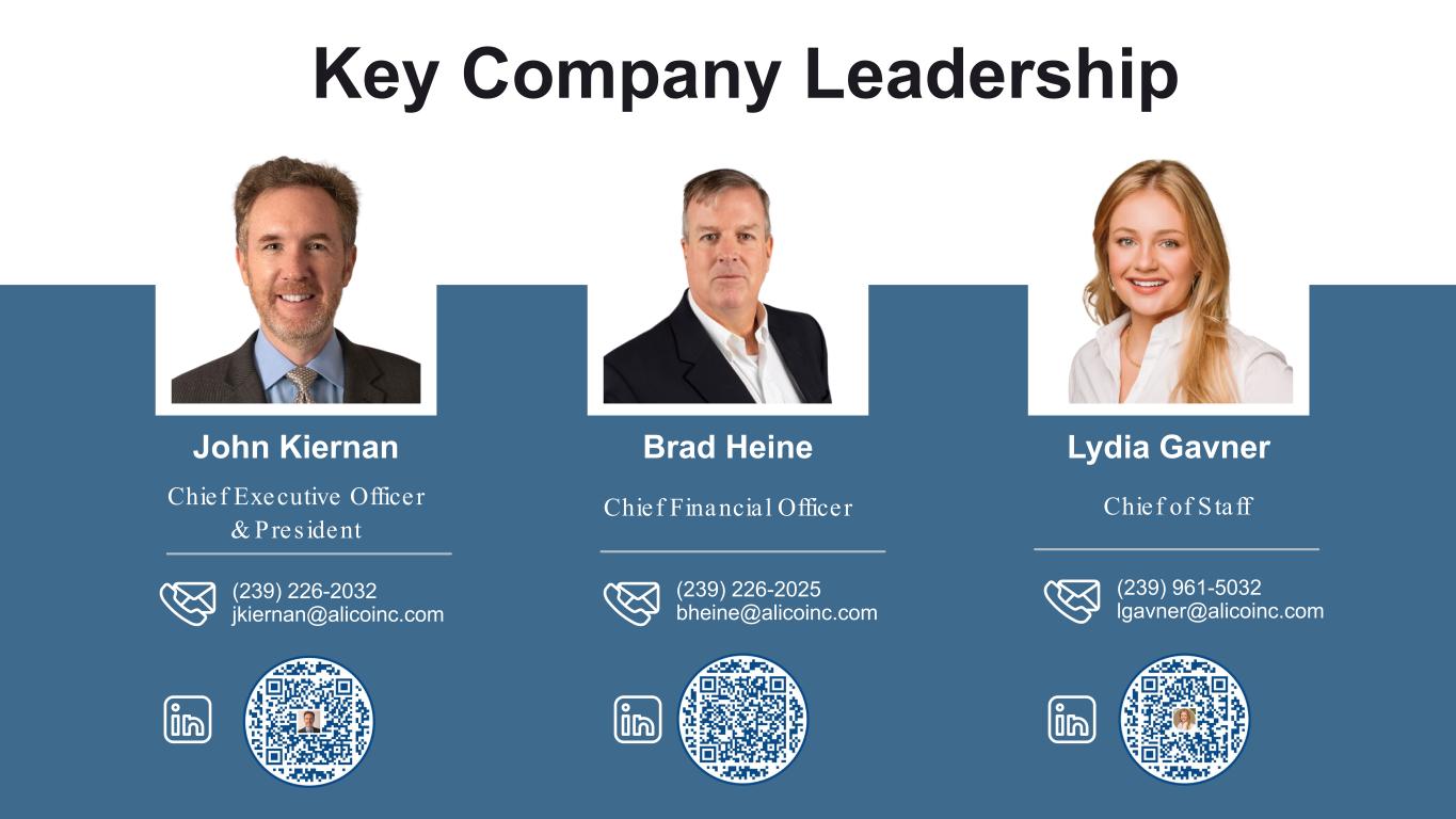 John Kiernan Chief Executive Office r & Pres ident Brad Heine Chief Financia l Office r Lydia Gavner Chief of S ta ff Key Company Leadership (239) 226-2032 jkiernan@alicoinc.com (239) 226-2025 bheine@alicoinc.com (239) 961-5032 lgavner@alicoinc.com