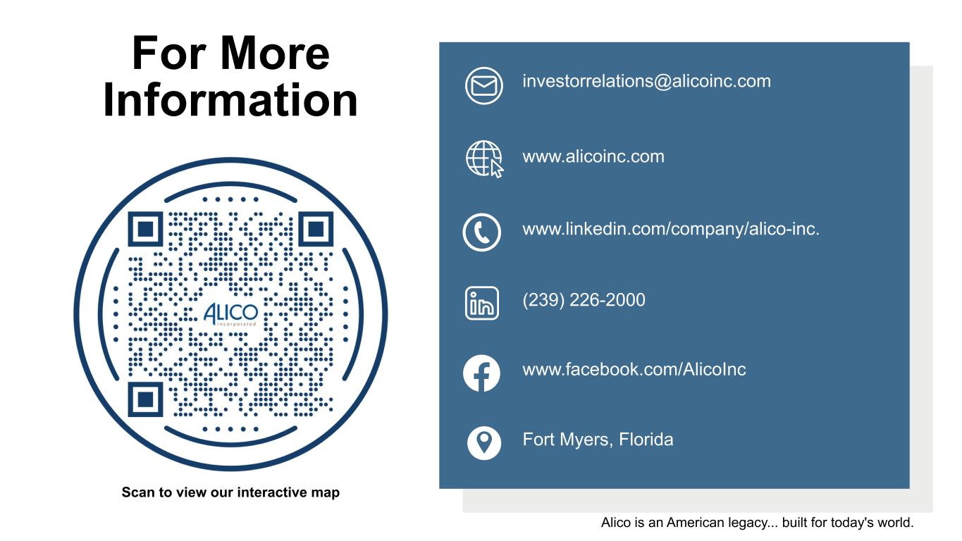 For More Information investorrelations@alicoinc.com www.alicoinc.com www.linkedin.com/company/alico-inc. www.facebook.com/AlicoInc Fort Myers, Florida (239) 226-2000 Scan to view our interactive map Alico is an American legacy... built for today's world.