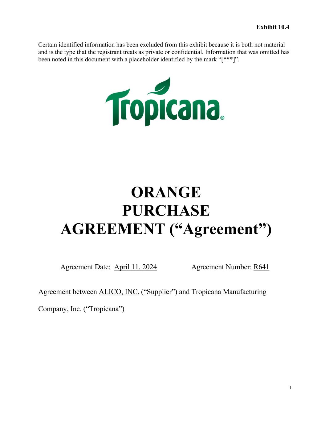 1 Certain identified information has been excluded from this exhibit because it is both not material and is the type that the registrant treats as private or confidential. Information that was omitted has been noted in this document with a placeholder identified by the mark “[***]”. ORANGE PURCHASE AGREEMENT (“Agreement”) Agreement Date: April 11, 2024 Agreement Number: R641 Agreement between ALICO, INC. (“Supplier”) and Tropicana Manufacturing Company, Inc. (“Tropicana”) Exhibit 10.4