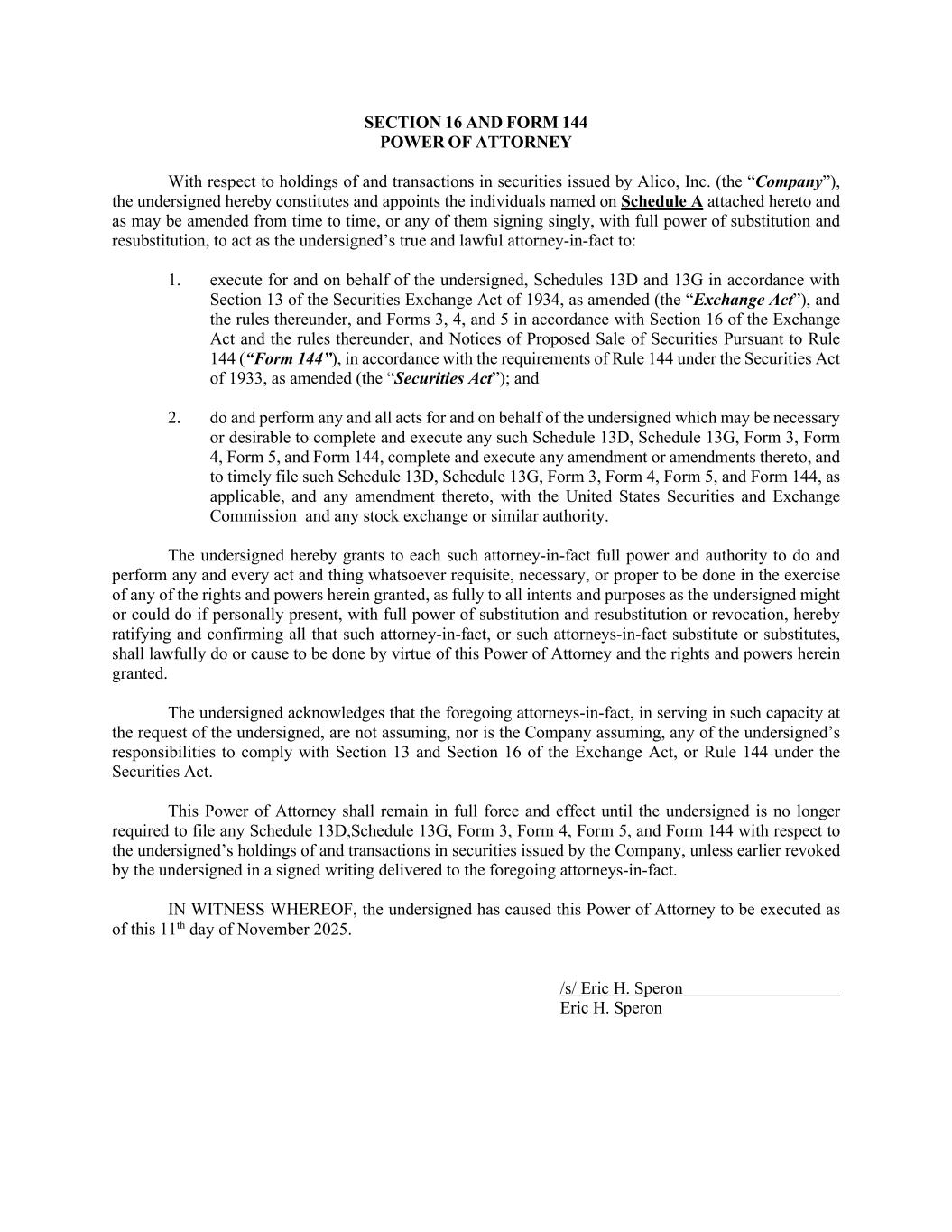 SECTION 16 AND FORM 144 POWER OF ATTORNEY With respect to holdings of and transactions in securities issued by Alico, Inc. (the “Company”), the undersigned hereby constitutes and appoints the individuals named on Schedule A attached hereto and as may be amended from time to time, or any of them signing singly, with full power of substitution and resubstitution, to act as the undersigned’s true and lawful attorney-in-fact to: 1. execute for and on behalf of the undersigned, Schedules 13D and 13G in accordance with Section 13 of the Securities Exchange Act of 1934, as amended (the “Exchange Act”), and the rules thereunder, and Forms 3, 4, and 5 in accordance with Section 16 of the Exchange Act and the rules thereunder, and Notices of Proposed Sale of Securities Pursuant to Rule 144 (“Form 144”), in accordance with the requirements of Rule 144 under the Securities Act of 1933, as amended (the “Securities Act”); and 2. do and perform any and all acts for and on behalf of the undersigned which may be necessary or desirable to complete and execute any such Schedule 13D, Schedule 13G, Form 3, Form 4, Form 5, and Form 144, complete and execute any amendment or amendments thereto, and to timely file such Schedule 13D, Schedule 13G, Form 3, Form 4, Form 5, and Form 144, as applicable, and any amendment thereto, with the United States Securities and Exchange Commission and any stock exchange or similar authority. The undersigned hereby grants to each such attorney-in-fact full power and authority to do and perform any and every act and thing whatsoever requisite, necessary, or proper to be done in the exercise of any of the rights and powers herein granted, as fully to all intents and purposes as the undersigned might or could do if personally present, with full power of substitution and resubstitution or revocation, hereby ratifying and confirming all that such attorney-in-fact, or such attorneys-in-fact substitute or substitutes, shall lawfully do or cause to be done by virtue of this Power of Attorney and the rights and powers herein granted. The undersigned acknowledges that the foregoing attorneys-in-fact, in serving in such capacity at the request of the undersigned, are not assuming, nor is the Company assuming, any of the undersigned’s responsibilities to comply with Section 13 and Section 16 of the Exchange Act, or Rule 144 under the Securities Act. This Power of Attorney shall remain in full force and effect until the undersigned is no longer required to file any Schedule 13D,Schedule 13G, Form 3, Form 4, Form 5, and Form 144 with respect to the undersigned’s holdings of and transactions in securities issued by the Company, unless earlier revoked by the undersigned in a signed writing delivered to the foregoing attorneys-in-fact. IN WITNESS WHEREOF, the undersigned has caused this Power of Attorney to be executed as of this 11th day of November 2025. /s/ Eric H. Speron Eric H. Speron