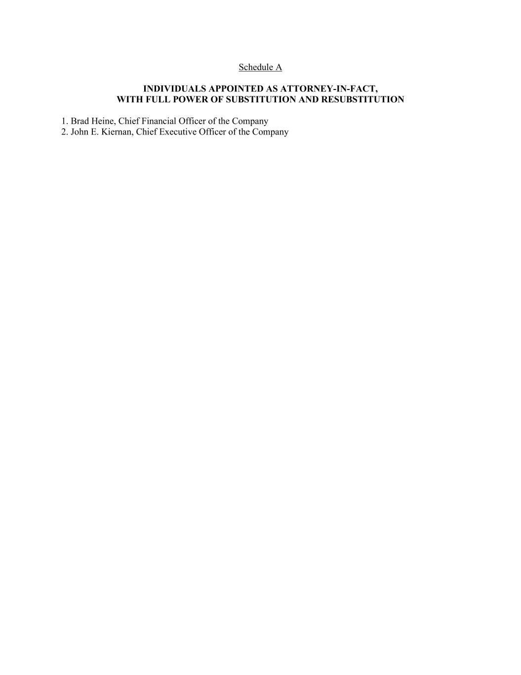 Schedule A INDIVIDUALS APPOINTED AS ATTORNEY-IN-FACT, WITH FULL POWER OF SUBSTITUTION AND RESUBSTITUTION 1. Brad Heine, Chief Financial Officer of the Company 2. John E. Kiernan, Chief Executive Officer of the Company