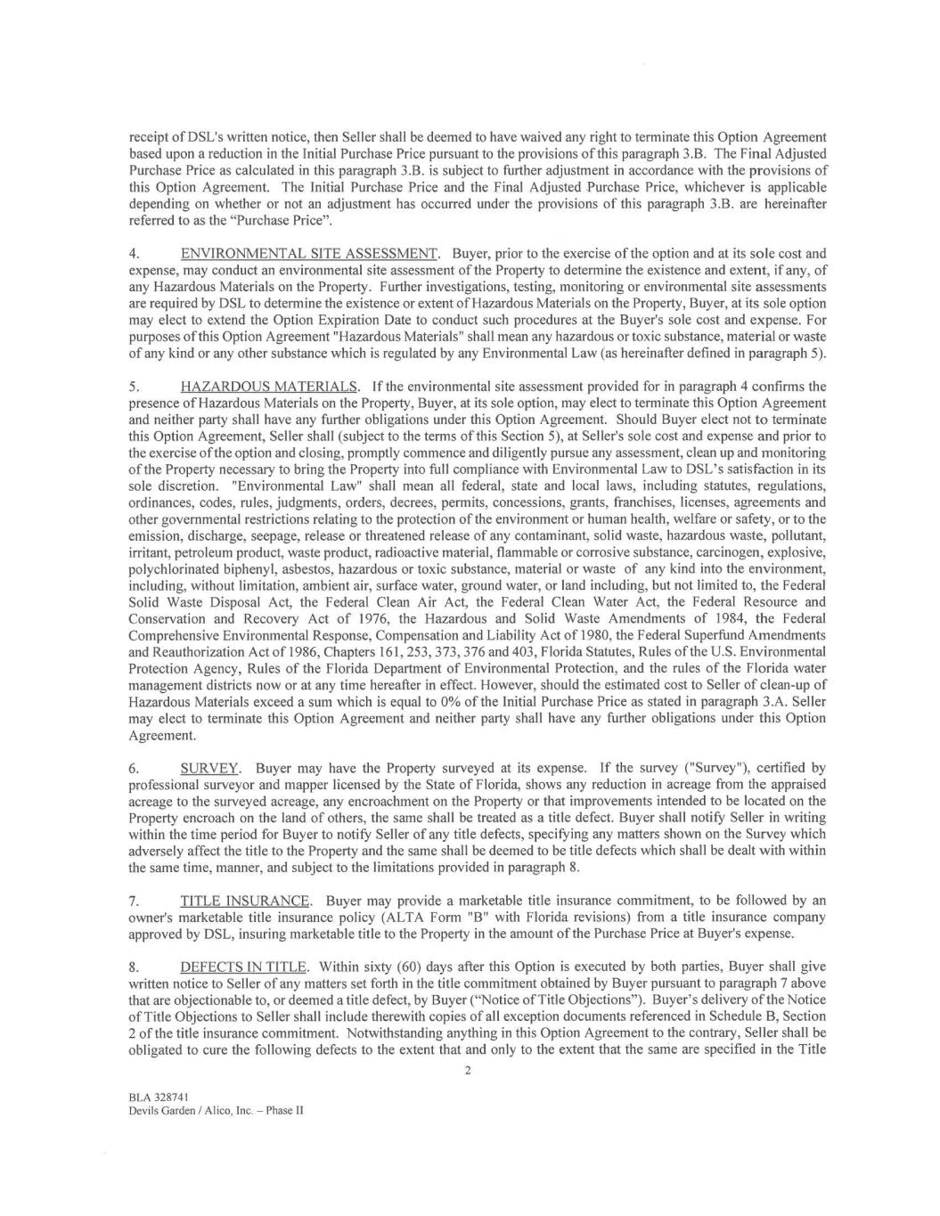 receipt of DSL's written notice, then Seller shall be deemed to have waived any right to terminate this Option Agreement based upon a reduction in the Initial Purchase Price pursuant to the provisions of this paragraph 3.B. The Final Adjusted Purchase Price as calculated in this paragraph 3.B. is subject to further adjustment in accordance with the provisions of this Option Agreement. The Initial Purchase Price and the Final Adjusted Purchase Price, whichever is applicable depending on whether or not an adjustment has occurred under the provisions of this paragraph 3.B. are hereinafter referred to as the "Purchase Price". 4. ENVIRONMENTAL SITE ASSESSMENT. Buyer, prior to the exercise of the option and at its sole cost and expense, may conduct an environmental site assessment of the Property to determine the existence and extent, if any, of any Hazardous Materials on the Property. Further investigations, testing, monitoring or environmental site assessments are required by DSL to determine the existence or extent of Hazardous Materials on the Property, Buyer, at its sole option may elect to extend the Option Expiration Date to conduct such procedures at the Buyer's sole cost and expense. For purposes of this Option Agreement "Hazardous Materials" shall mean any hazardous or toxic substance, material or waste of any kind or any other substance which is regulated by any Environmental Law (as hereinafter defined in paragraph 5). 5. HAZARDOUS MATERIALS. If the environmental site assessment provided for in paragraph 4 confirms the presence of Hazardous Materials on the Property, Buyer, at its sole option, may elect to terminate this Option Agreement and neither party shall have any further obligations under this Option Agreement. Should Buyer elect not to terminate this Option Agreement, Seller shall (subject to the terms of this Section 5), at Seller's sole cost and expense and prior to the exercise of the option and closing, promptly commence and diligently pursue any assessment, clean up and monitoring of the Property necessary to bring the Property into full compliance with Environmental Law to DSL's satisfaction in its sole discretion. "Environmental Law" shall mean all federal, state and local laws, including statutes, regulations, ordinances, codes, rules, judgments, orders, decrees, permits, concessions, grants, franchises, licenses, agreements and other governmental restrictions relating to the protection of the environment or human health, welfare or safety, or to the emission, discharge, seepage, release or threatened release of any contaminant, solid waste, hazardous waste, pollutant, irritant, petroleum product, waste product, radioactive material, flammable or corrosive substance, carcinogen, explosive, polychlorinated biphenyl, asbestos, hazardous or toxic substance, material or waste of any kind into the environment, including, without limitation, ambient air, surface water, ground water, or land including, but not limited to, the Federal Solid Waste Disposal Act, the Federal Clean Air Act, the Federal Clean Water Act, the Federal Resource and Conservation and Recovery Act of 1976, the Hazardous and Solid Waste Amendments of 1984, the Federal Comprehensive Environmental Response, Compensation and Liability Act of 1980, the Federal Superfund Amendments and Reauthorization Act of 1986, Chapters 161, 253, 373, 376 and 403, Florida Statutes, Rules of the U.S. Environmental Protection Agency, Rules of the Florida Department of Environmental Protection, and the rules of the Florida water management districts now or at any time hereafter in effect. However, should the estimated cost to Seller of clean-up of Hazardous Materials exceed a sum which is equal to 0% of the Initial Purchase Price as stated in paragraph 3.A. Seller may elect to terminate this Option Agreement and neither party shall have any further obligations under this Option Agreement. 6. SURVEY. Buyer may have the Property surveyed at its expense. If the survey ("Survey"), certified by professional surveyor and mapper licensed by the State of Florida, shows any reduction in acreage from the appraised acreage to the surveyed acreage, any encroachment on the Property or that improvements intended to be located on the Property encroach on the land of others, the same shall be treated as a title defect. Buyer shall notify Seller in writing within the time period for Buyer to notify Seller of any title defects, specifying any matters shown on the Survey which adversely affect the title to the Property and the same shall be deemed to be title defects which shall be dealt with within the same time, manner, and subject to the limitations provided in paragraph 8. 7. TITLE INSURANCE. Buyer may provide a marketable title insurance commitment, to be followed by an owner's marketable title insurance policy (ALTA Form "B" with Florida revisions) from a title insurance company approved by DSL, insuring marketable title to the Property in the amount of the Purchase Price at Buyer's expense. 8. DEFECTS IN TITLE. Within sixty (60) days after this Option is executed by both parties, Buyer shall give written notice to Seller of any matters set forth in the title commitment obtained by Buyer pursuant to paragraph 7 above that are objectionable to, or deemed a title defect, by Buyer ("Notice of Title Objections"). Buyer's delivery of the Notice of Title Objections to Seller shall include therewith copies of all exception documents referenced in Schedule B, Section 2 of the title insurance commitment. Notwithstanding anything in this Option Agreement to the contrary, Seller shall be obligated to cure the following defects to the extent that and only to the extent that the same are specified in the Title 2 KA 328741 Devils Garden / Alico, Inc. — Phase II