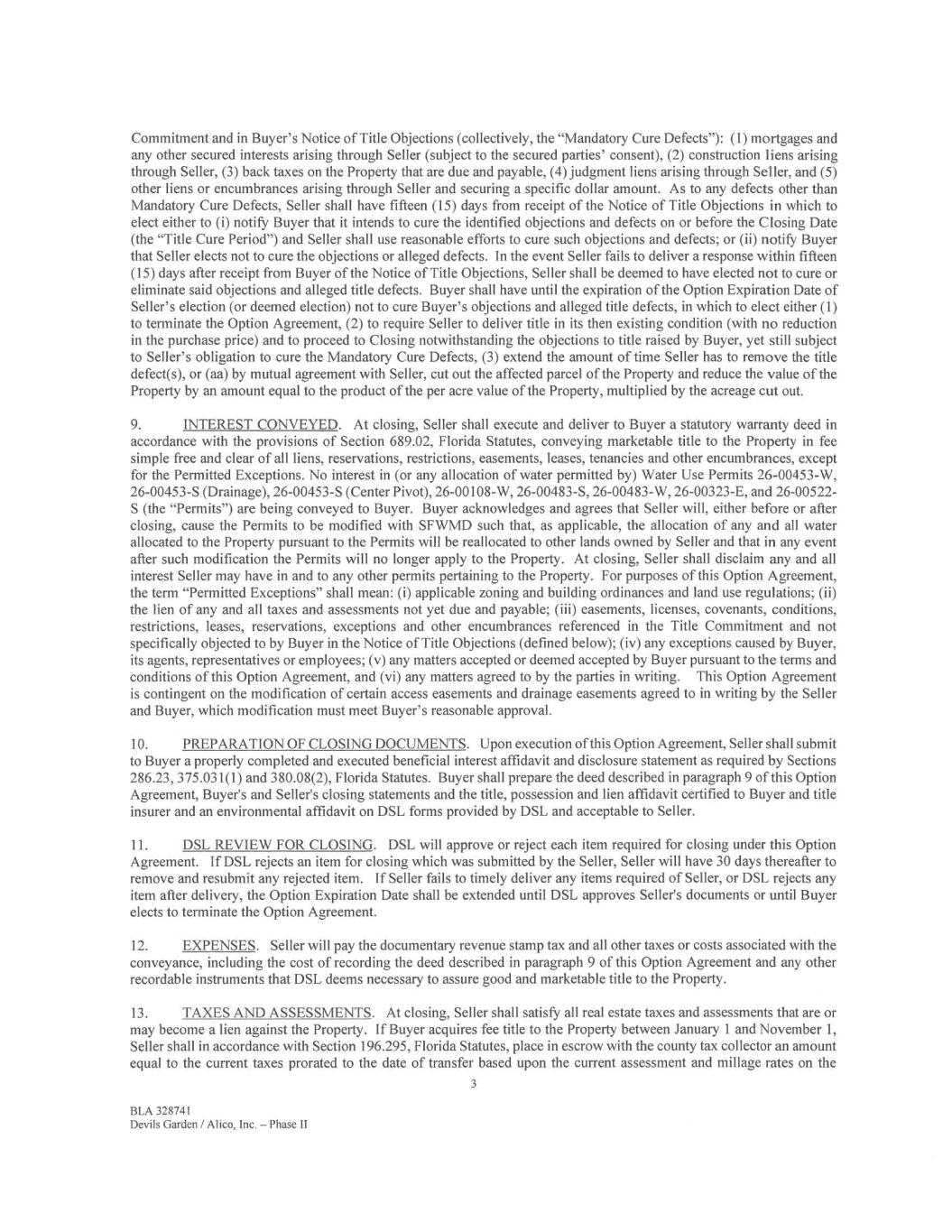 Commitment and in Buyer's Notice of Title Objections (collectively, the "Mandatory Cure Defects"): (1) mortgages and any other secured interests arising through Seller (subject to the secured parties' consent), (2) construction liens arising through Seller, (3) back taxes on the Property that are due and payable, (4) judgment liens arising through Seller, and (5) other liens or encumbrances arising through Seller and securing a specific dollar amount. As to any defects other than Mandatory Cure Defects, Seller shall have fifteen (15) days from receipt of the Notice of Title Objections in which to elect either to (i) notify Buyer that it intends to cure the identified objections and defects on or before the Closing Date (the "Title Cure Period") and Seller shall use reasonable efforts to cure such objections and defects; or (ii) notify Buyer that Seller elects not to cure the objections or alleged defects. In the event Seller fails to deliver a response within fifteen (15) days after receipt from Buyer of the Notice of Title Objections, Seller shall be deemed to have elected not to cure or eliminate said objections and alleged title defects. Buyer shall have until the expiration of the Option Expiration Date of Seller's election (or deemed election) not to cure Buyer's objections and alleged title defects, in which to elect either (1) to terminate the Option Agreement, (2) to require Seller to deliver title in its then existing condition (with no reduction in the purchase price) and to proceed to Closing notwithstanding the objections to title raised by Buyer, yet still subject to Seller's obligation to cure the Mandatory Cure Defects, (3) extend the amount of time Seller has to remove the title defect(s), or (aa) by mutual agreement with Seller, cut out the affected parcel of the Property and reduce the value of the Property by an amount equal to the product of the per acre value of the Property, multiplied by the acreage cut out. 9. INTEREST CONVEYED. At closing, Seller shall execute and deliver to Buyer a statutory warranty deed in accordance with the provisions of Section 689.02, Florida Statutes, conveying marketable title to the Property in fee simple free and clear of all liens, reservations, restrictions, easements, leases, tenancies and other encumbrances, except for the Permitted Exceptions. No interest in (or any allocation of water permitted by) Water Use Permits 26-00453-W, 26-00453-S (Drainage), 26-00453-S (Center Pivot), 26-00108-W, 26-00483-S, 26-00483-W, 26-00323-E, and 26-00522- S (the "Permits") are being conveyed to Buyer. Buyer acknowledges and agrees that Seller will, either before or after closing, cause the Permits to be modified with SFWMD such that, as applicable, the allocation of any and all water allocated to the Property pursuant to the Permits will be reallocated to other lands owned by Seller and that in any event after such modification the Permits will no longer apply to the Property. At closing, Seller shall disclaim any and all interest Seller may have in and to any other permits pertaining to the Property. For purposes of this Option Agreement, the term "Permitted Exceptions" shall mean: (i) applicable zoning and building ordinances and land use regulations; (ii) the lien of any and all taxes and assessments not yet due and payable; (iii) easements, licenses, covenants, conditions, restrictions, leases, reservations, exceptions and other encumbrances referenced in the Title Commitment and not specifically objected to by Buyer in the Notice of Title Objections (defined below); (iv) any exceptions caused by Buyer, its agents, representatives or employees; (v) any matters accepted or deemed accepted by Buyer pursuant to the terms and conditions of this Option Agreement, and (vi) any matters agreed to by the parties in writing. This Option Agreement is contingent on the modification of certain access easements and drainage easements agreed to in writing by the Seller and Buyer, which modification must meet Buyer's reasonable approval. 10. PREPARATION OF CLOSING DOCUMENTS. Upon execution of this Option Agreement, Seller shall submit to Buyer a properly completed and executed beneficial interest affidavit and disclosure statement as required by Sections 286.23, 375.031(1) and 380.08(2), Florida Statutes. Buyer shall prepare the deed described in paragraph 9 of this Option Agreement, Buyer's and Seller's closing statements and the title, possession and lien affidavit certified to Buyer and title insurer and an environmental affidavit on DSL forms provided by DSL and acceptable to Seller. 11. DSL REVIEW FOR CLOSING. DSL will approve or reject each item required for closing under this Option Agreement. If DSL rejects an item for closing which was submitted by the Seller, Seller will have 30 days thereafter to remove and resubmit any rejected item. If Seller fails to timely deliver any items required of Seller, or DSL rejects any item after delivery, the Option Expiration Date shall be extended until DSL approves Seller's documents or until Buyer elects to terminate the Option Agreement. 12. EXPENSES. Seller will pay the documentary revenue stamp tax and all other taxes or costs associated with the conveyance, including the cost of recording the deed described in paragraph 9 of this Option Agreement and any other recordable instruments that DSL deems necessary to assure good and marketable title to the Property. 13. TAXES AND ASSESSMENTS. At closing, Seller shall satisfy all real estate taxes and assessments that are or may become a lien against the Property. If Buyer acquires fee title to the Property between January 1 and November 1, Seller shall in accordance with Section 196.295, Florida Statutes, place in escrow with the county tax collector an amount equal to the current taxes prorated to the date of transfer based upon the current assessment and millage rates on the 3 BLA 328741 Devils Garden / Alico, Inc. — Phase II
