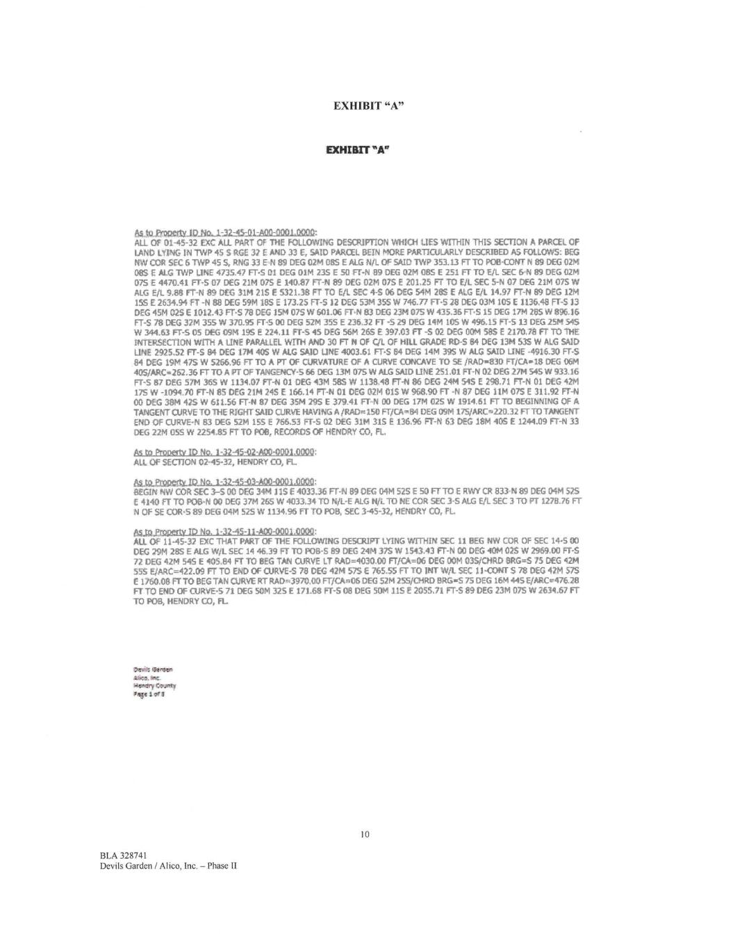 MIMT *A" (amt) As to Prooetly ID No. 1-32-45-26-A00-00010200: DtAT PART OF SEC 26-45-32 LYNG NW OF THE FOILLOWING DESCREIM LEGAL EEG 1.1iN 03R SEC 27 T455 R32E-5 00 DEG 3114 135E PLG W/L SEC 27 2067.05 FT-N 89 DEG 0314 19$ E 50 FT-CONT N 89 DEG 03/4 19$ E 4080.01 FT TO POB- N 63 DEG 5311 03S E 4851.28 FT TO N/L SEC 26 T45S R32E-4 89 DEG 0714 135 E ALG SAM N/L 9.96 FT-S 50 DEG 06/4 365 E 2818.27 FT 11;) E/.. SEC 26-CONT S 50 DEG 0611365 E 2019.17 FT TO REG CF CURVE IT RAD=839.94 FI7CA-35 DEG 33/4 22~1) BRG=S 67 DEG 5311175 E/PRCe521.24 FT TO 841) OF CURVE-S 85 DEG 324 365 E 212.47 FT -S01 DEG 0114 445 E 11534 FT-N 85 DEG 351136$ W22338 FT TO BEG CURVE RT RAD=954.94 FT/Ole---35 DEG 33M 22.5,04t0 EIRGeN 67 DEG 5314175 W/ARO--592.61 FT TO DID OF CURVE-N SO DEG 061436$ W 180533 FT-S 89 DEG 07M 135W 5428.01 FT TO W/L SEC 26-5 89 DEG 0314 195W 1191.31 FT, HENORY CO, FL As to Prottertv ID No. 1-32-45-27-A00-0001.0000: N 1/2 OF SEC 2745-32 EXC RO D1C ALL EXC THAT PART OF THE FCLLOW1NG MSCRP LY1NG WTTNIN SEC 27-0EG NW CCR SEC 27 TWP 45S RC£ 32E-S 00 CEG 3114 13S E 2067.05 ALG W S/L-N 89 DEG 03M 19S E 50 FT TO RD RWY MD POB-CONT N 89 DEG 0314 19$ E 5271.32 ETT() E/1 SEC 2741 89DC-G 0714 135 E 5428.01 Fr 10 dL2C2 CANAL-S 50 MG 061136$ £180533 FT ALG CANAL CX TO BEG TAN CURVE LT/RAD454.94 FT/CA-45 DEG 33/4 22.5/01RD BRG2.-S 67 DEG 53/4 175 E/ARC=592.61 FT TO END OF CUPVE-S 85 DEG 394 365 E 223.58 FT ALG C/t. CANAL-S 01 DEG 0611 E 1492.50 FT-S 57 DEG 1811 03$ W 402.50 FTTO BEG TAN CURVE RT/RAD35 FT/CA=32 DEG 2111 12S/CHRD BRG'S 73 DEG294 395 W/ARC.---358.94 FT TO END OF CURVE-5 89 DEG 4111 1.55 W 78538 FT-S 89 DEG 1114306 W 759.44 Fr ir) Witt. SEC 25-S 89 DEG 07M 01S W 2668.43 FT TO 1NT OF NS 1/4 Sil SEC 26-S 00 DEG 46M 305 E 50 Ff 10 S 1/4 COR SEC 26-S 89 DEG 0711 015W 2668.30 FT TO SW COR SEC 2641 00 DEG 48/4 54S W 2162.60 Fr-s 89 DEG 0514 11S W 2663.21 FT-N 00 DEG 41M 44 S W 495.14 FT-S 89 DEG 05/4 28S W 2612.00 FTTO E RD RWY-N 00 DEG 31M 13$ W598,25 FT TO PM, HENDRY CO, FL., .I to Proit ID No. 1-3245-Q1-A " *0001 ALL GF 9~o1-45-33 ExCRD-gWY 4- EXC N 50 FT EXC SE 1/4 Of NE 1/4 OF NE 1/4 EXC NE 1/4 OF SE 1/4 OF NE 1/4 EXCCANAL RWY, HENDRY CO, FL Ps to Pro txtw ID No. 1-33-45-01-A00-0003.0000: NE 1/4 CF SE 1/4 OF NE 1/4 OF SECttON 0145-33 EXC RO RWY, HENDRYCO, FL As to Prooecly ID No, 1-3345-01-A00-0004,0000: SE 1/4 OF NE 1/4 OF NE 1/4 OF SECTICM 0145-33 ExC RO RWY, HENDRY CO, FL As to PrOtlet1Y ID No. 1-3345-02~1.0000: ALI. OF SECTION 0245-33 EXC N 50 FT + EXC CANAL RWY 616.83 AC SURFACE AND PARTIAL SUBSURFACE ASSESSMENT BALANCE CF SUBSURFACE ~le« ON R-fr0245-33-A004001.0000, tr-ENDRY CO, FL Dekeli Gl•dan let Heft* y r.iJtmty Pabeci 13 BLA 328741 Devils Garden / Alico, Inc. - Phase II
