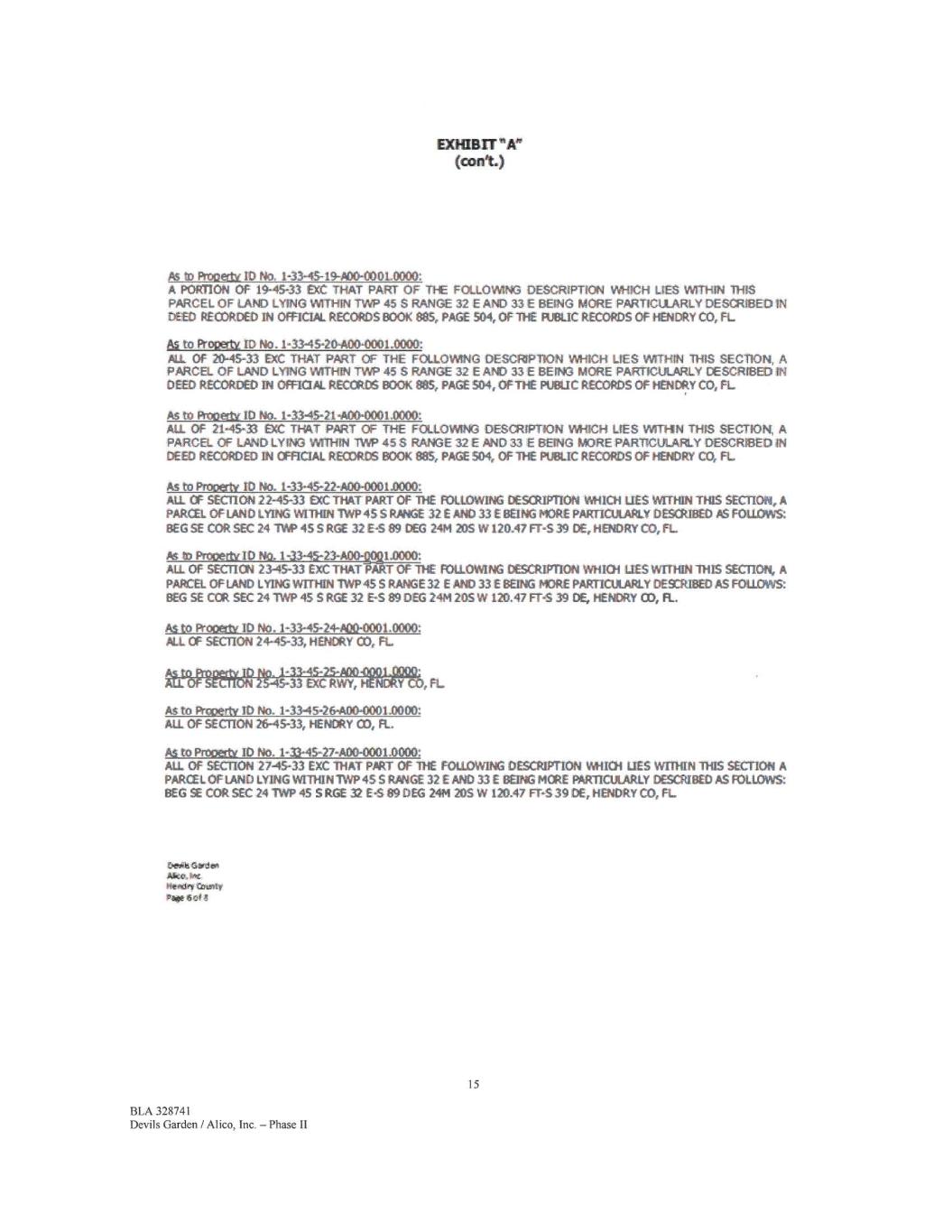 EXHIBIT "A" (Cal%) As to Prooetti ID No. 1-33-45-28-AD0-0001.12000: ALL OF SECTION 28-45-33 EXC THAT PART OF THE FOLLOWING DESCRIPTION WHICH LIES WITHIN THIS SECTION, A PARCEL OF LAND LYING WITHIN TWP 45 S RANGE 32 E AND 33 E BEING MORE PARTICULARLY DESCRIBED ik.S FOLLOWS: BEG SE COR C 241WP 45 S RGE 32 E-S 89 DEG 24M 205 W 120.47 FT-S 390€, HEMAY CO, FL P6 to Prooerty ID No. 1-33-45-28400-0003.0000: NI OF 28-45-33 EXC THAT PART OF THE FOLLOWING DESCRIPTION WHICH UES WITHIN THIS SECTION, A PARCEL OF LAND LYING WITHIN nW 455 RANGE 32 E AND 33€ BEING MORE PARTICULARLY DESCRIBED IN WED RECORDED IN OPFMAL RECORDS BOOK 8,35, PAGE 504, OF THE PUBLIC RECORDS OF HENDRY CO, P., As to Prow* ID No. 1-33-45-29400-0001.0000: ALL OF 29-45-33 RC THAT PART OF THE FOLLOWING DESCRIPTION WHICH LIES WITHIN THIS SECTION, A PARCEL OF LAND LYING WITHIN TVW 45 S RANGE 32 E AND 33 E BEING MORE PARTICULARLY DESCRIBED DEEDS RECORDED IN OFFICIAL RECORDS BOO( 885, PAGE 504, OFFICIAL RECORDS BOOK 1024, PA/SE 455, OFFICIAL RECORDS BOOK 1028, PAGE 937, AND OFFICIAL RECORDS BOOK 1034, ME 428, OF THE puetic RECORDS OF HENDRY CO, FL As to ProPettt ID No. 1-33-45-30-A00-0001.0000: A PORTION OF 30-45-33 EXC THAT PART OF THE FOLLOWING DESCRIPTION WHICH LIES WITHIN THIS PARCEL OF LAND LYING WITHIN TVVP 45 S RANGE 32 E AND 33 E BEING MORE PARTICULARLY DESCRIBED IN DEEDS RECORDED IN OFFICIAL RECORDS BOOK 88S, MX 504, OFFICIAL RECORDS BOCK 1037, PAGE 291, OFFICIAL RECORDS BOOK 1042, PAGE 494, MO OFFICIAL RECORDS BOOK 1042, PAGE 535, OF THE PUBLIC RECORDS OP HENDRY CO, FL As ta PitOeitt ID No. 1-33-45-33-A00-0001.0002: A PCRTICN OF SECTION 33-45-33 EXC THAT PART OF THE FOLLOWING DESCRIPTION WHICH LIES WITHIN THIS PARCEL OF LAND LYING vvrnim TWP 45 S RANGE 32 E AND 33€ BEING MORE PARTICULARLY DESCRIBED AS FOLLOWS BEG SE COR SEC 24 TWP 45 S RGE 32 E-S 89 DEC 24M 205 W 120.47 FT-S 39 DE, HENDRY CO, FL As to Property 11) No. 1-33-45-34A00-0001.0000; ALL OF SECTION 34-45-33, HENDRY CO, FL As to Proosty ID No. 1-33-45-35-A00-0001.0000: ALL OF SECTION 35-45-33, HENDRY CO, FL AS to Property ID No. 1-33-45-36400-0001.0000: All OF SECTION 36-45-33 INC RWY, HENDRY CO, FL Devils Gs rest Mk*. kix. Par 7 of 8 16 BLA 328741 Devils Garden / Alico, Inc. — Phase II