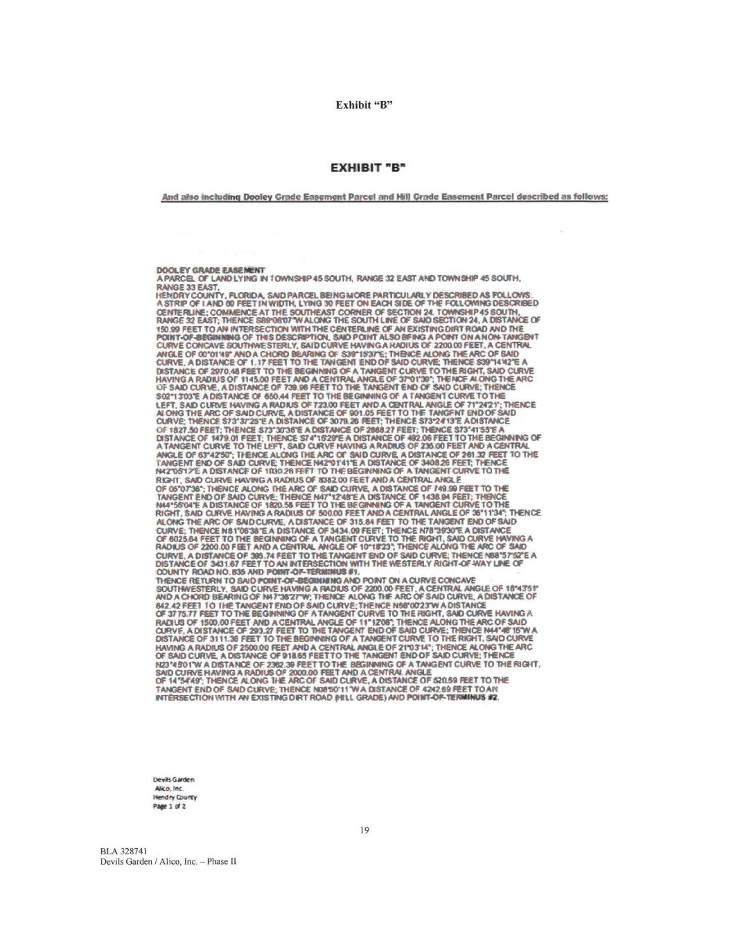Exhibit "B" EXHIBIT "B" And also including Dooley Grade Easement Parcel and Fill Grade Easement Parcel descnInni as follow= DOOLEY GRADE EASEMENT A PARCEL. OF LAND LYING IN 1 OWNSHIP46 SOUTH, RANGE 32 EAST AND TOWNSHIP 45 SOUTH. RANGE 33 EAST, HENDRY 00UNTY, FLORIDA, SAO PARC& BONG MORE FIARTICULARLY DESMIED A.S FOLLOWS: A grow OF I *10 00 FEET IN WIDTH, LYING 30 FEET ON EACH 9 DE OPT** FIXLCANING DESCRIBED CENTERUW COM&TENCE AT THE SOUTHEAST CORNER OF SECTION 24. TOWNSHIP* SOUTH. RANGE 32 EAST; THENCE 93910607•W ALONG THE SOUTH LINE OF SAO SECTION 24, A DISTANCE OF 1$0.99 FEET TO AN INTERSECTION WITH THECENTEJRLINE OF AN EXISTING DIRT ROAD AND THE POINT.OF-GEGINNING OF THIS DESCMPTION„ SMO PONT A4800E110 A POINT ON ANONTANGINT CURVE CONCAVE SOUTTMESTERLY. SAID CURVE HAVINGA RADIUS OF 220000 FEET, A CENTRAL ANGLE Of 00101411' ANDA CHOW BEARING OF S3r1531rE; THENCE AU3010 THE PitC OF SAO CURVE, A DISTANCE Cr 1..1? FEET TO THE TANGENT ENDOF SAID CURVE 'THENCE sarovore A DISTANCE OF 2070.46 FEET TO THE BEGINNING OF A TANGENT CURVE TOTIpiE. RIGHT. SAID CURVE PAVING A RADIUS OF 1146.00 FEET NO A CENTRAL ANGLE OF 37-0119; THENCE M ONG THE ARC C/E SAID CURVE, A DISTANCE OF 739.96 FEET TO THE TANGENT END OF SAID CURVE; THENCE 8021303E A DISTANCE Of 660A4 FEET TO THE BEGINNING OF A TANGENT CURVE TOT** LEFT, SAID CURVE HAVING A RADIUS Of 723.00 FEET AND A CSYTRAL ANGLE OF 71'2421'; THENCE Al. ONG THE ARC OF SAID CURVE, A DISTANCE OF 901 DS FEET TO THE TANGENT ENDOF SAID CURVE; THENCE S73S/25-E A DISTANCE OF 307126 MET; THENCE S731413E ADISTANCE OF ierrzo FEET; THENCE S73-3016* A DISTANCE OF 266827 EEO': THENCE 6734115E A DISTANCE OF 147E01 FEET; THENCE S7e1621YE A DISTANCE OF 492.06 FEET TOTHE BEGIMING OF A TANGENT CURVE TO THE LEFT, SAO CURVE HAVING A RADIUS Of 236,00 FEET AND A CENTRAL ANGLE OF 634250`; 11ENCE ALONG THE ARC Cr SAID CURVE A DISTANCE OF 261.32 FEET 10 THE TANGENT END OF SAO CURVE THENCE 1442'0E41T A DISTANCE OF 340826 FEET: THENCE 1442'0617E A DISTANCE OF 1(tI026 WET TO THE BEGINNING OF A TANGENT CURVE TO THE ROHL SAID CuRVE HAVING A RADIUS OF 1082.00 met ANDA CENTRAL ANGLE OF 06•07136; THENCE &ONG THE ARC OF SAID CURVE, A DISTANCE Of 149.99 FEET 10 TIE TANGENT DO OF SAID CURVE THENCE N4r12.41rE A DISTANCE OF 143E94 FEET; THENCE 1444*5SO4E A DISTANCE OF 1920.56 FEET TO THE BEGINNING OF A TANGENT CURVE TO THE RIGHT, SAID CURVE HAVING A RADIUS OF 500.00 FEET AND A CENTRAL ANGLE OF 3811134*; THENCE ALONG THE ARC OF SAID CURVE, A DISTANCE OF 315_84 FEET TO THE TANGENT END OF SAID CURVE, THENICEN81'0638EA DISTANCE OF 3434.09 FEET; THENCE 14781930"E A DISTANCE OF 602564 FEET TO THE BEGINNING OF A TANGENT CURVE TO THE RIGHT, SAID CURVE HAVING A RADIUS OF 2200.00 FEET AND A MORAL ANGLE OF 10r18`23"; THENcE AU:1103 THE ARC OF SAID CURVE, A DISTANCE OF 39S .74 FEET TO THE TANGENT END OF SAID CURVE; THENCE 10313.12"StE A DISTANCE OT 343167 FEET TOM INTERSECTION Wrni THE il&ESTERLY RIGHT•OFWAY LEE OF COUNTY IROAD NO.. 835 AND POINT-OF.TERAIMIUS 11, THENCE RETURN TO SAID P0INT-CF43ECOINING AND PONT ON A CURVE CONCAVE SOUTHWESTERLY, SAID CURVE PAVING A RADIUS OF 2200.00 FEET, A.CENTRAL ANGLE OF 18'431r AND A CHORD SEARING OF 1441 .,8u W; THENCE ALONG TI-IF ARC OF SAID CURVE, A DISTANCE. OF 642.42 FEET TO THE TANGENT ENO OF SAID CURVE THENCE s56'o0r2TW A DISTANCE OF 37 /5.37 FEET TO THE BEGINNING OF &TANGENT CURVE TO THE RIGHT; SAID CURIE HAVING A RADIUS OF 1500,00 FEET AND A CENTRAL ANGLE OF 1i'12061 THENCE ALONG THE ARC OF SAID CURVE, A DISTANCE OF 203.27 FEET TO THE TANGENT END OF SAID CURVE;. THENCE 1444*413415W A DISTANCE OF 3111.30 FEET TO THE BEGINNING OF A TANGENT CURVE TO THE 1111311T, SAID CURVE HAVING A RADIUS OF 260900 FEET' AND A CENTRAL ANGLE OF 21'0314'; THENCE ALONG THE ARC OF $AID CURVE A DISTANCE OF 91865 FEETTO THE TANGENT ENDOF SAID CURVE THENCE 123*4 601"0/ A DISTANCE OF 2182.39 FEET TO THE EIEGINMNG OF A TANGENT CURVE TO THE RIGHT, SAID CURVE HAVING A RADIUS OF 2000,00 FEET AND A CENTRAL ANGLE OF 14144111-, THENCE ALONG THE ARC Of SAID CURVE, A DISTANCE OF 62059 FEET TO THE TANGENT END OF SAID CURVE; THENCE N001i0111N A DISTANCE OF 4242E9 FEET TO Art NTERSECIION WITH AN ExiSTiNG ORT ROAD 111111 GRADE) AND POINT-0/mIVROONIIS 92. Dells Gaidee, Alto, W. Plenclfy awry, Page I 012 19 BLA 328741 Devils Garden / Alico, Inc. -Phase II