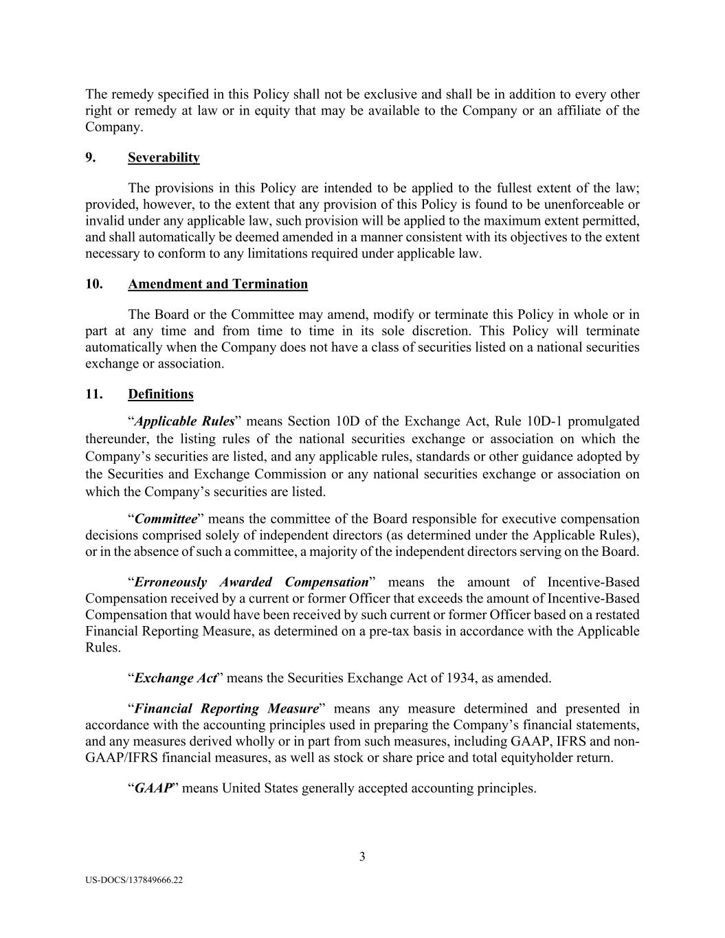 3 US-DOCS/137849666.22 The remedy specified in this Policy shall not be exclusive and shall be in addition to every other right or remedy at law or in equity that may be available to the Company or an affiliate of the Company. 9. Severability The provisions in this Policy are intended to be applied to the fullest extent of the law; provided, however, to the extent that any provision of this Policy is found to be unenforceable or invalid under any applicable law, such provision will be applied to the maximum extent permitted, and shall automatically be deemed amended in a manner consistent with its objectives to the extent necessary to conform to any limitations required under applicable law. 10. Amendment and Termination The Board or the Committee may amend, modify or terminate this Policy in whole or in part at any time and from time to time in its sole discretion. This Policy will terminate automatically when the Company does not have a class of securities listed on a national securities exchange or association. 11. Definitions “Applicable Rules” means Section 10D of the Exchange Act, Rule 10D-1 promulgated thereunder, the listing rules of the national securities exchange or association on which the Company’s securities are listed, and any applicable rules, standards or other guidance adopted by the Securities and Exchange Commission or any national securities exchange or association on which the Company’s securities are listed. “Committee” means the committee of the Board responsible for executive compensation decisions comprised solely of independent directors (as determined under the Applicable Rules), or in the absence of such a committee, a majority of the independent directors serving on the Board. “Erroneously Awarded Compensation” means the amount of Incentive-Based Compensation received by a current or former Officer that exceeds the amount of Incentive-Based Compensation that would have been received by such current or former Officer based on a restated Financial Reporting Measure, as determined on a pre-tax basis in accordance with the Applicable Rules. “Exchange Act” means the Securities Exchange Act of 1934, as amended. “Financial Reporting Measure” means any measure determined and presented in accordance with the accounting principles used in preparing the Company’s financial statements, and any measures derived wholly or in part from such measures, including GAAP, IFRS and non- GAAP/IFRS financial measures, as well as stock or share price and total equityholder return. “GAAP” means United States generally accepted accounting principles.