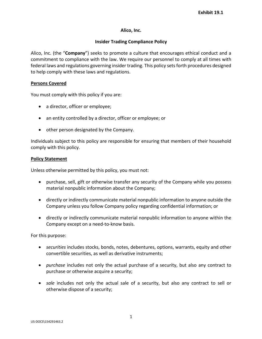 1 US-DOCS\154291463.2 Alico, Inc. Insider Trading Compliance Policy Alico, Inc. (the “Company”) seeks to promote a culture that encourages ethical conduct and a commitment to compliance with the law. We require our personnel to comply at all times with federal laws and regulations governing insider trading. This policy sets forth procedures designed to help comply with these laws and regulations. Persons Covered You must comply with this policy if you are: • a director, officer or employee; • an entity controlled by a director, officer or employee; or • other person designated by the Company. Individuals subject to this policy are responsible for ensuring that members of their household comply with this policy. Policy Statement Unless otherwise permitted by this policy, you must not: • purchase, sell, gift or otherwise transfer any security of the Company while you possess material nonpublic information about the Company; • directly or indirectly communicate material nonpublic information to anyone outside the Company unless you follow Company policy regarding confidential information; or • directly or indirectly communicate material nonpublic information to anyone within the Company except on a need-to-know basis. For this purpose: • securities includes stocks, bonds, notes, debentures, options, warrants, equity and other convertible securities, as well as derivative instruments; • purchase includes not only the actual purchase of a security, but also any contract to purchase or otherwise acquire a security; • sale includes not only the actual sale of a security, but also any contract to sell or otherwise dispose of a security; Exhibit 19.1