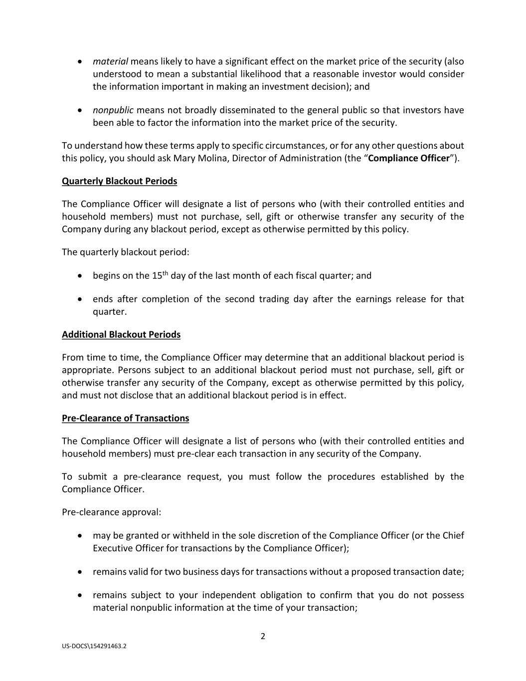 2 US-DOCS\154291463.2 • material means likely to have a significant effect on the market price of the security (also understood to mean a substantial likelihood that a reasonable investor would consider the information important in making an investment decision); and • nonpublic means not broadly disseminated to the general public so that investors have been able to factor the information into the market price of the security. To understand how these terms apply to specific circumstances, or for any other questions about this policy, you should ask Mary Molina, Director of Administration (the “Compliance Officer”). Quarterly Blackout Periods The Compliance Officer will designate a list of persons who (with their controlled entities and household members) must not purchase, sell, gift or otherwise transfer any security of the Company during any blackout period, except as otherwise permitted by this policy. The quarterly blackout period: • begins on the 15th day of the last month of each fiscal quarter; and • ends after completion of the second trading day after the earnings release for that quarter. Additional Blackout Periods From time to time, the Compliance Officer may determine that an additional blackout period is appropriate. Persons subject to an additional blackout period must not purchase, sell, gift or otherwise transfer any security of the Company, except as otherwise permitted by this policy, and must not disclose that an additional blackout period is in effect. Pre-Clearance of Transactions The Compliance Officer will designate a list of persons who (with their controlled entities and household members) must pre-clear each transaction in any security of the Company. To submit a pre-clearance request, you must follow the procedures established by the Compliance Officer. Pre-clearance approval: • may be granted or withheld in the sole discretion of the Compliance Officer (or the Chief Executive Officer for transactions by the Compliance Officer); • remains valid for two business days for transactions without a proposed transaction date; • remains subject to your independent obligation to confirm that you do not possess material nonpublic information at the time of your transaction;