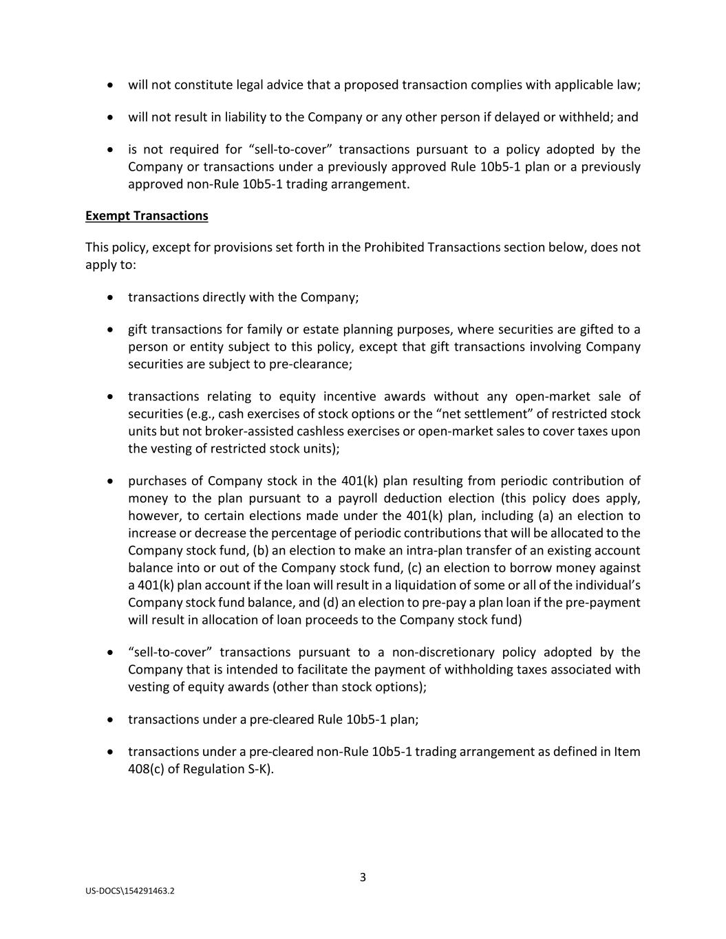 3 US-DOCS\154291463.2 • will not constitute legal advice that a proposed transaction complies with applicable law; • will not result in liability to the Company or any other person if delayed or withheld; and • is not required for “sell-to-cover” transactions pursuant to a policy adopted by the Company or transactions under a previously approved Rule 10b5-1 plan or a previously approved non-Rule 10b5-1 trading arrangement. Exempt Transactions This policy, except for provisions set forth in the Prohibited Transactions section below, does not apply to: • transactions directly with the Company; • gift transactions for family or estate planning purposes, where securities are gifted to a person or entity subject to this policy, except that gift transactions involving Company securities are subject to pre-clearance; • transactions relating to equity incentive awards without any open-market sale of securities (e.g., cash exercises of stock options or the “net settlement” of restricted stock units but not broker-assisted cashless exercises or open-market sales to cover taxes upon the vesting of restricted stock units); • purchases of Company stock in the 401(k) plan resulting from periodic contribution of money to the plan pursuant to a payroll deduction election (this policy does apply, however, to certain elections made under the 401(k) plan, including (a) an election to increase or decrease the percentage of periodic contributions that will be allocated to the Company stock fund, (b) an election to make an intra-plan transfer of an existing account balance into or out of the Company stock fund, (c) an election to borrow money against a 401(k) plan account if the loan will result in a liquidation of some or all of the individual’s Company stock fund balance, and (d) an election to pre-pay a plan loan if the pre-payment will result in allocation of loan proceeds to the Company stock fund) • “sell-to-cover” transactions pursuant to a non-discretionary policy adopted by the Company that is intended to facilitate the payment of withholding taxes associated with vesting of equity awards (other than stock options); • transactions under a pre-cleared Rule 10b5-1 plan; • transactions under a pre-cleared non-Rule 10b5-1 trading arrangement as defined in Item 408(c) of Regulation S-K).