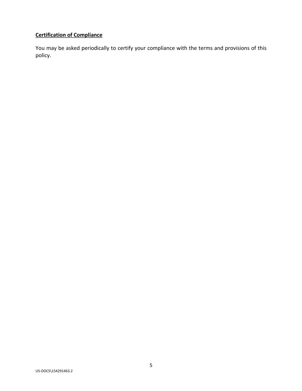 5 US-DOCS\154291463.2 Certification of Compliance You may be asked periodically to certify your compliance with the terms and provisions of this policy.