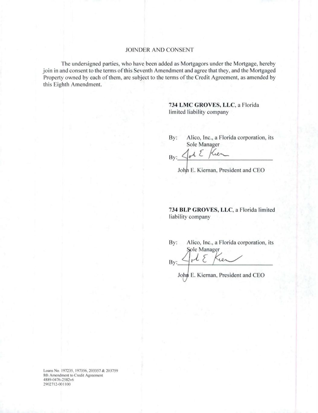 JOINDER AND CONSENT The undersigned parties, who have been added as Mortgagors under the Mortgage, hereby join in and consent to the terms of this Seventh Amendment and agree that they, and the Mortgaged Property owned by each of them, are subject to the terms of the Credit Agreement, as amended by this Eighth Amendment. 734 LMC GROVES, LLC, a Florida limited liability company By: Alico, Inc., a Florida corporation, its Sole Mana er By: E. Kiernan, President and CEO 734 BLP GROVES, LLC, a Florida limited liability company By: Alico, Inc., a Florida corporation, its le Manager By: E Jo E. Kiernan, President and CEO Loans No. 197235, 197356,203357 & 203759 8th Amendment to Credit Agreement 4889-0476-2582v6 2902712-001100