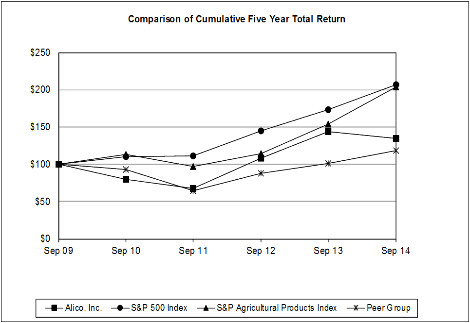 The aggregate market value of the voting and nonvoting common equity held by non-affiliates based on the closing price, as quoted on the NASDAQ as of March 31, 2014 (the last business day of Alico’s most recently completed second fiscal quarter) was $112,809,559.20. Solely for the purposes of this calculation, the registrant has elected to treat all executives, officers and greater than 10% shareholders as affiliates of the registrant. There were 7,366,738 shares of stock outstanding at December 5, 2014.