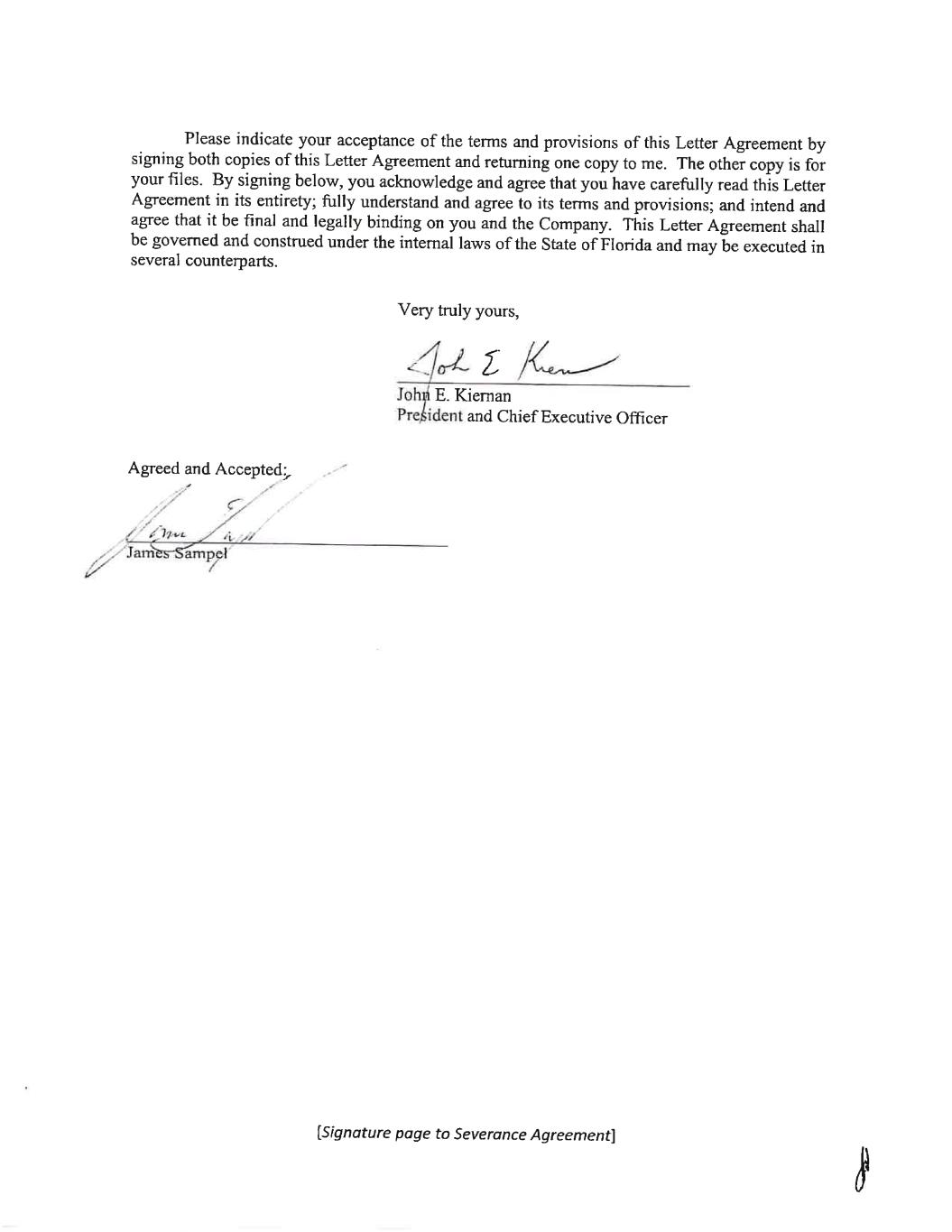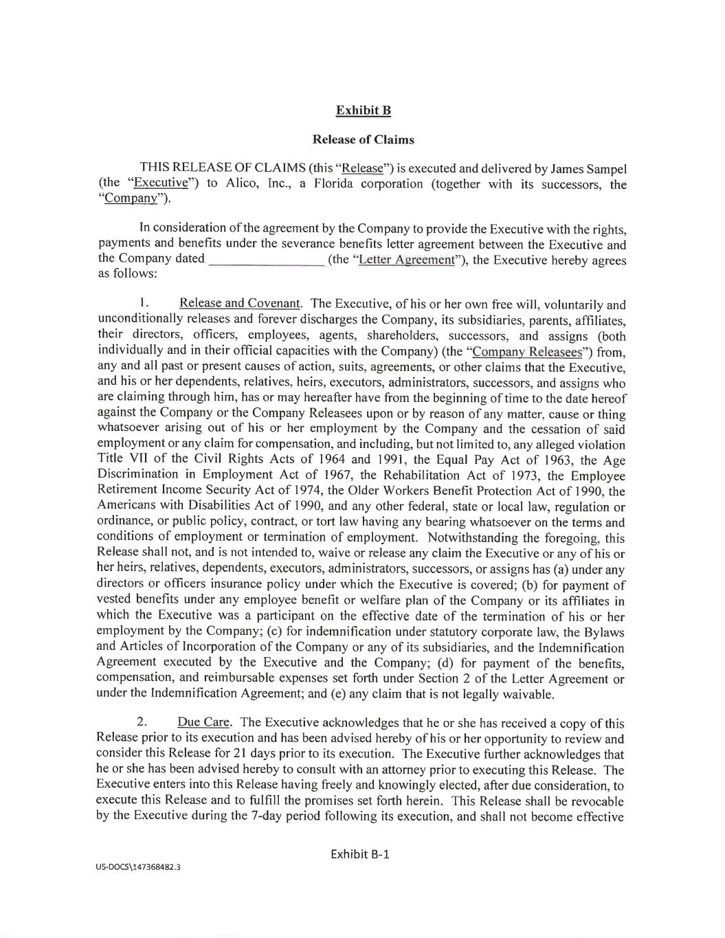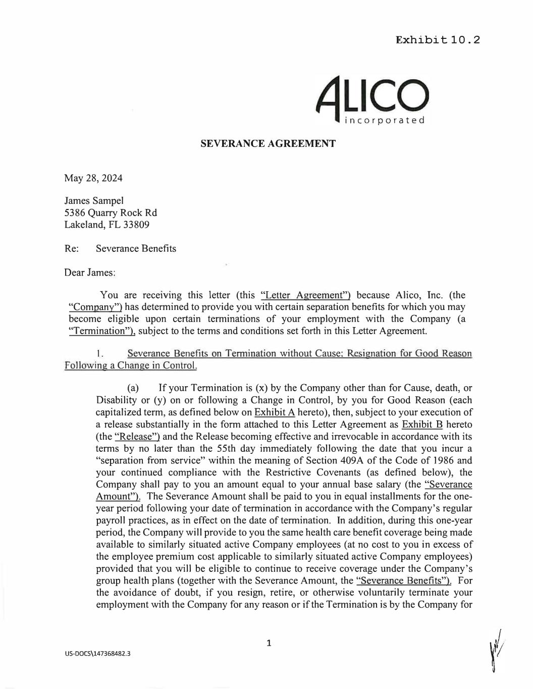 May 28, 2024 James Sampel 5386 Quarry Rock Rd Lakeland, FL 33809 Re: Severance Benefits Dear James: SEVERANCE AGREEMENT You are rece1Vmg this letter (this "Letter Agreement") because Alico, Inc. (the "Company") has determined to provide you with certain separation benefits for which you may become eligible upon certain terminations of your employment with the Company (a "Termination"), subject to the terms and conditions set forth in this Letter Agreement. 1. Severance Benefits on Termination without Cause: Resignation for Good Reason Following a Change in Control. (a) If your Termination is (x) by the Company other than for Cause, death, or Disability or (y) on or following a Change in Control, by you for Good Reason (each capitalized term, as defined below on Exhibit A hereto), then, subject to your execution of a release substantially in the form attached to this Letter Agreement as Exhibit B hereto (the "Release") and the Release becoming effective and irrevocable in accordance with its terms by no later than the 55th day immediately following the date that you incur a "separation from service" within the meaning of Section 409A of the Code of 1986 and your continued compliance with the Restrictive Covenants (as defined below), the Company shall pay to you an amount equal to your annual base salary (the "Severance Amount"). The Severance Amount shall be paid to you in equal installments for the one year period following your date of termination in accordance with the Company's regular payroll practices, as in effect on the date of termination. In addition, during this one-year period, the Company will provide to you the same health care benefit coverage being made available to similarly situated active Company employees ( at no cost to you in excess of the employee premium cost applicable to similarly situated active Company employees) provided that you will be eligible to continue to receive coverage under the Company's group health plans (together with the Severance Amount, the "Severance Benefits"). For the avoidance of doubt, if you resign, retire, or otherwise voluntarily terminate your employment with the Company for any reason or if the Termination is by the Company for 1 US-DOCS\147368482.3 Exhibit 10.2