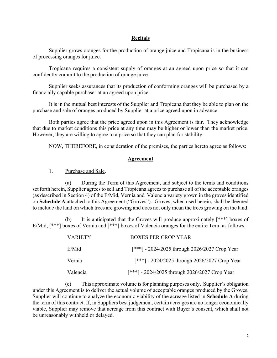 2 Recitals Supplier grows oranges for the production of orange juice and Tropicana is in the business of processing oranges for juice. Tropicana requires a consistent supply of oranges at an agreed upon price so that it can confidently commit to the production of orange juice. Supplier seeks assurances that its production of conforming oranges will be purchased by a financially capable purchaser at an agreed upon price. It is in the mutual best interests of the Supplier and Tropicana that they be able to plan on the purchase and sale of oranges produced by Supplier at a price agreed upon in advance. Both parties agree that the price agreed upon in this Agreement is fair. They acknowledge that due to market conditions this price at any time may be higher or lower than the market price. However, they are willing to agree to a price so that they can plan for stability. NOW, THEREFORE, in consideration of the premises, the parties hereto agree as follows: Agreement 1. Purchase and Sale. (a) During the Term of this Agreement, and subject to the terms and conditions set forth herein, Supplier agrees to sell and Tropicana agrees to purchase all of the acceptable oranges (as described in Section 4) of the E/Mid, Vernia and Valencia variety grown in the groves identified on Schedule A attached to this Agreement (“Groves”). Groves, when used herein, shall be deemed to include the land on which trees are growing and does not only mean the trees growing on the land. (b) It is anticipated that the Groves will produce approximately [***] boxes of E/Mid, [***] boxes of Vernia and [***] boxes of Valencia oranges for the entire Term as follows: VARIETY BOXES PER CROP YEAR E/Mid [***] - 2024/2025 through 2026/2027 Crop Year Vernia [***] - 2024/2025 through 2026/2027 Crop Year Valencia [***] - 2024/2025 through 2026/2027 Crop Year (c) This approximate volume is for planning purposes only. Supplier’s obligation under this Agreement is to deliver the actual volume of acceptable oranges produced by the Groves. Supplier will continue to analyze the economic viability of the acreage listed in Schedule A during the term of this contract. If, in Suppliers best judgement, certain acreages are no longer economically viable, Supplier may remove that acreage from this contract with Buyer’s consent, which shall not be unreasonably withheld or delayed.